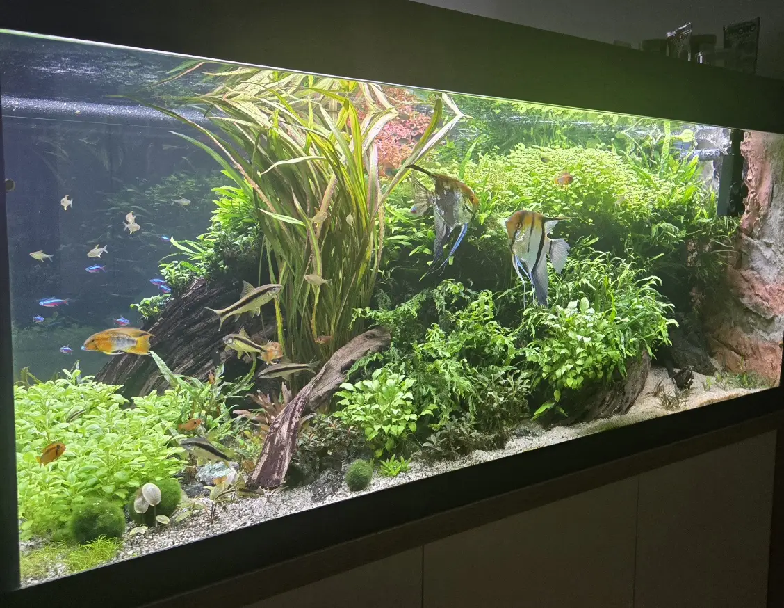 Popis: Do nového domu jsem si jako radost pořídil nové velké akvárium, po zkušenostech s předchozím rohovým 350l akváriem jsem se rozhodl pro 900l, které tvoří předěl mezi kuchyní a obývacím pokojem. Moje představa byla vytvořit velký svět pro malé rybky. Snažím se taky vyhovět představě mé ženy, aby dominantou našeho nového domu nebyla žumpa