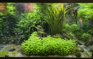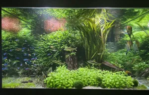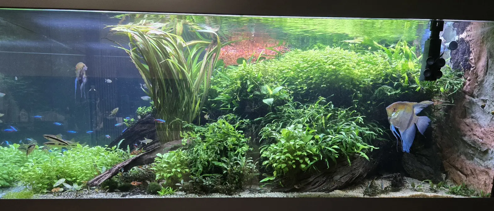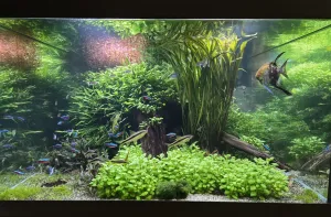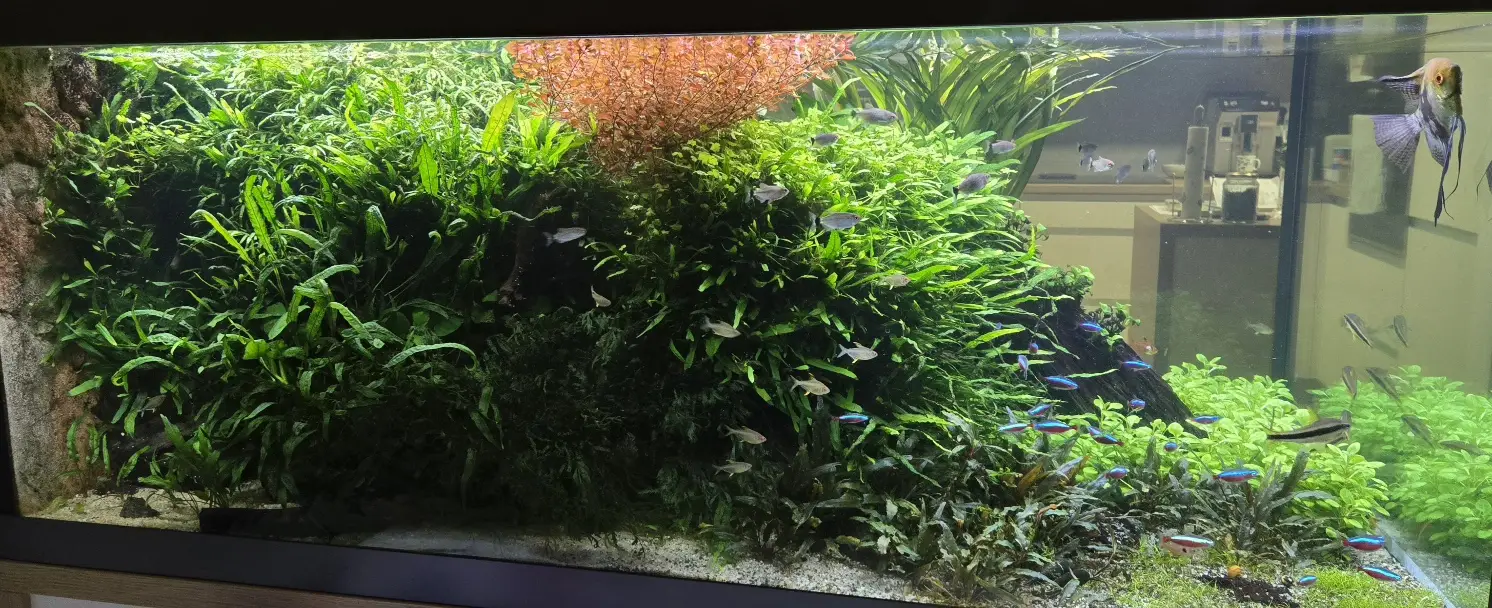 Dekorace: Velký centrální útes z kořenů a kamenů dominantně osázený Microsoriem, aby se rybky cítily i přes umístění v prostoru dobře