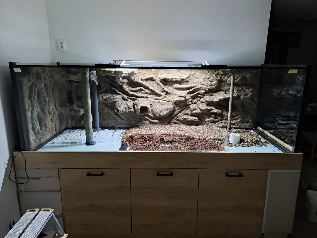 Stojan: Zděný - ztracené bedění, vyzděno "U". Osb desky, fasadní polystyren pod akváriem. Rozdíl původního rozměru vyzdění z tisícoky jsem dohnal porfixem - přizděný na ztracenko. Původně zde měl být nový obklad jako bude kolem kamen. Prý to barevně neladí s dekorem obložení, takže tam nakonec dolepím SDK a bude bílý nátěr.