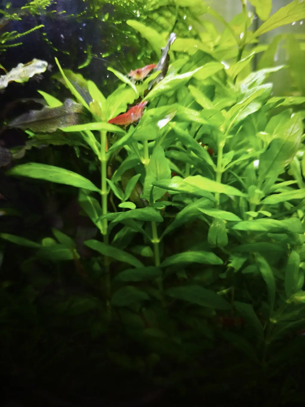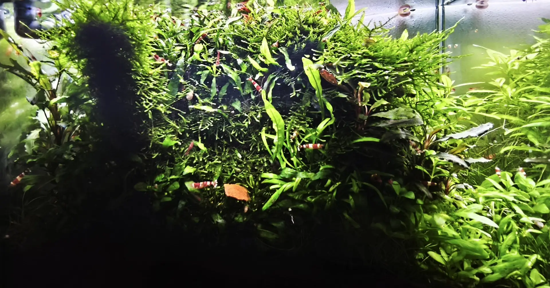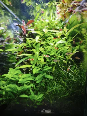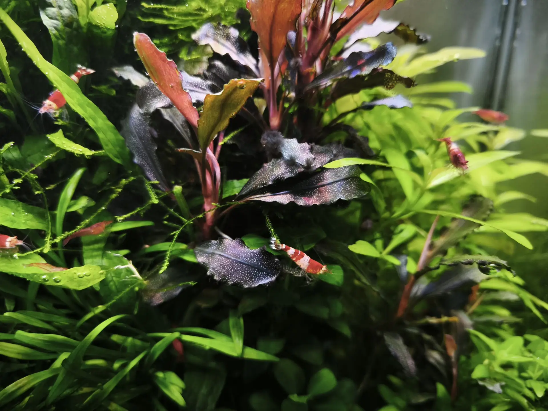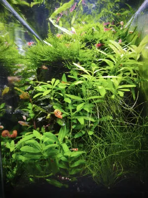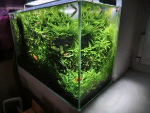 Údržba: 1x týdně výměna 50% vody, občas prostříhání microsoria, protrhání mechu a redukce plovoucího phyllanthu