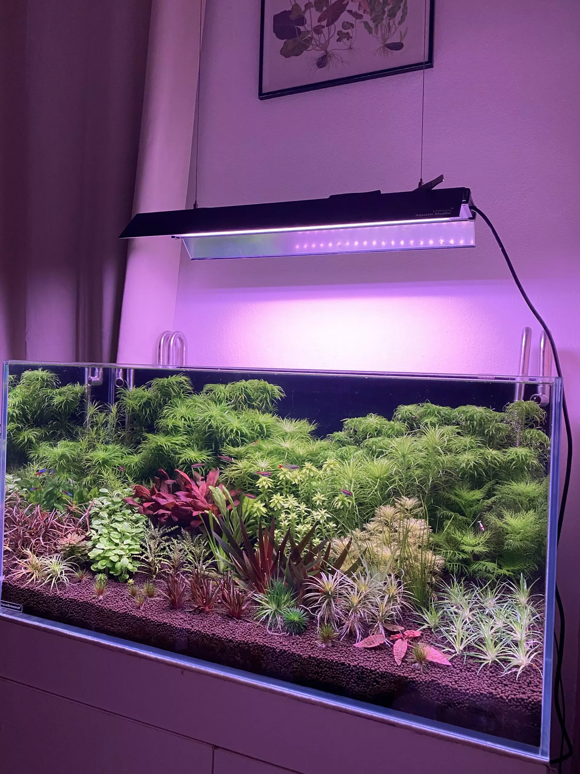 Při zakládání bylo použito 48l japonského mastersoilu, balení ADA bacter100 a clear super.