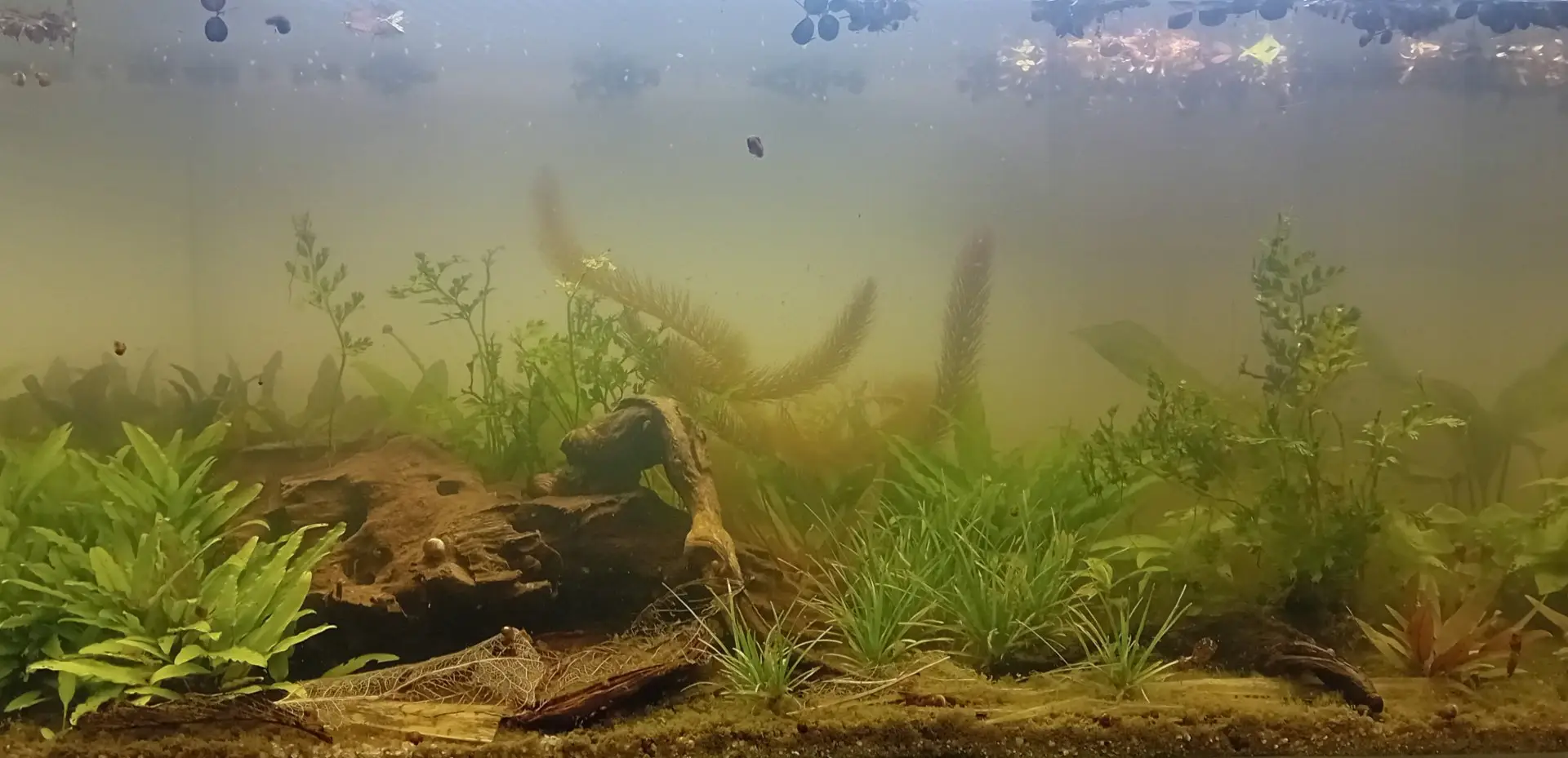 Poznámka: Původní záměr byl biotop napodobující příbřežní oblast jezera Indawgyi, kde se jehlounci vyskytují. Vypadalo by to asi nějak takhle: Rákosový porost se spoustou ulámaných rákosových stébel, nahusto přeslenice a sem tam leknín, na hladině plovoučky, na dně bahno, listí a klacky tlustě obalené zelenou řasou. V tom by se jehlounkům líbilo, ale vytvořit a udržet něco takového by se dalo asi ve 100 litrech a s filtrem. Protože 100 litrů ani filtr v plánu nebyly, musela jsem na biotop resignovat a vytvořit oku přijateně lahodící směsku asijských kytek.
