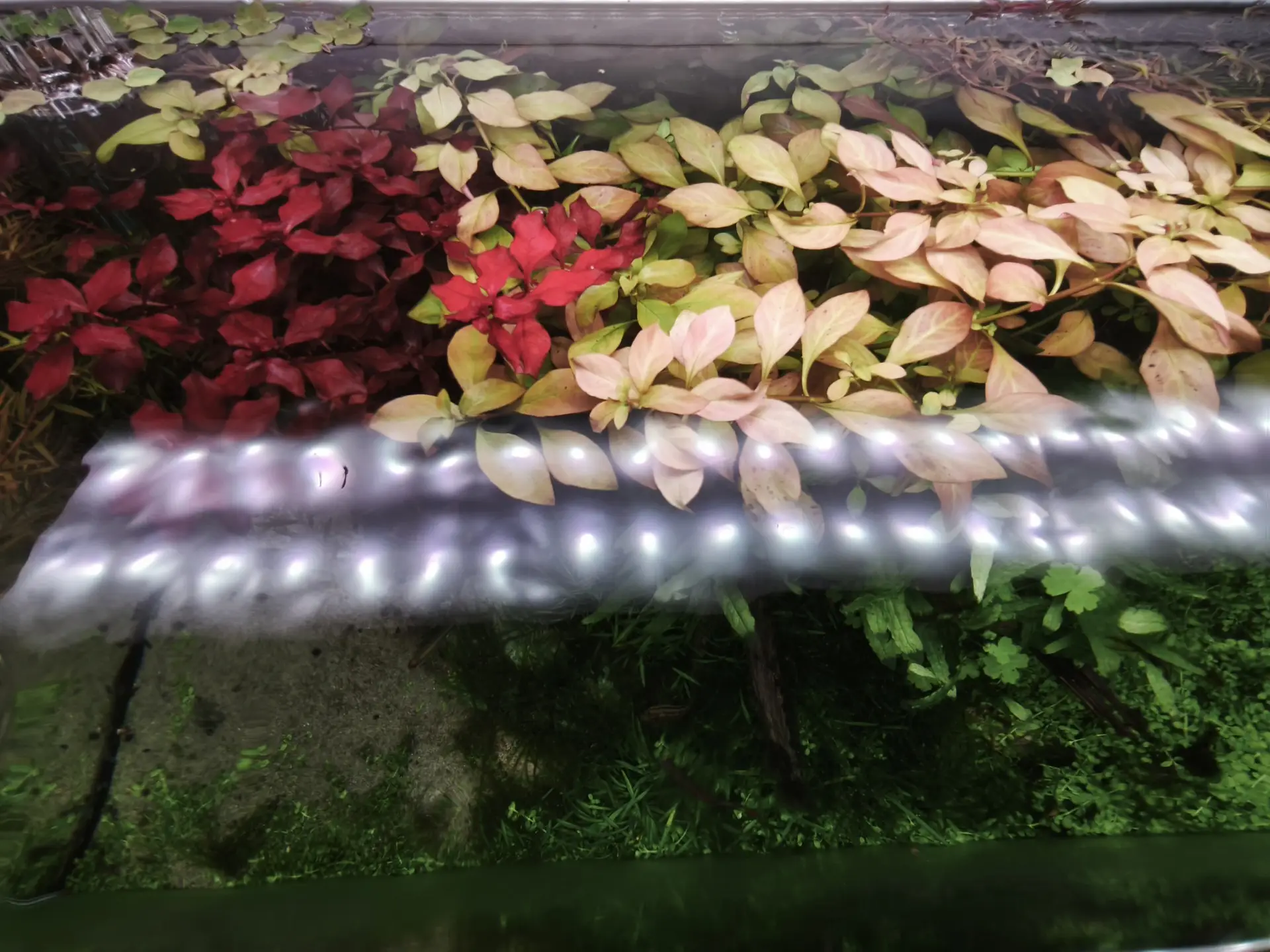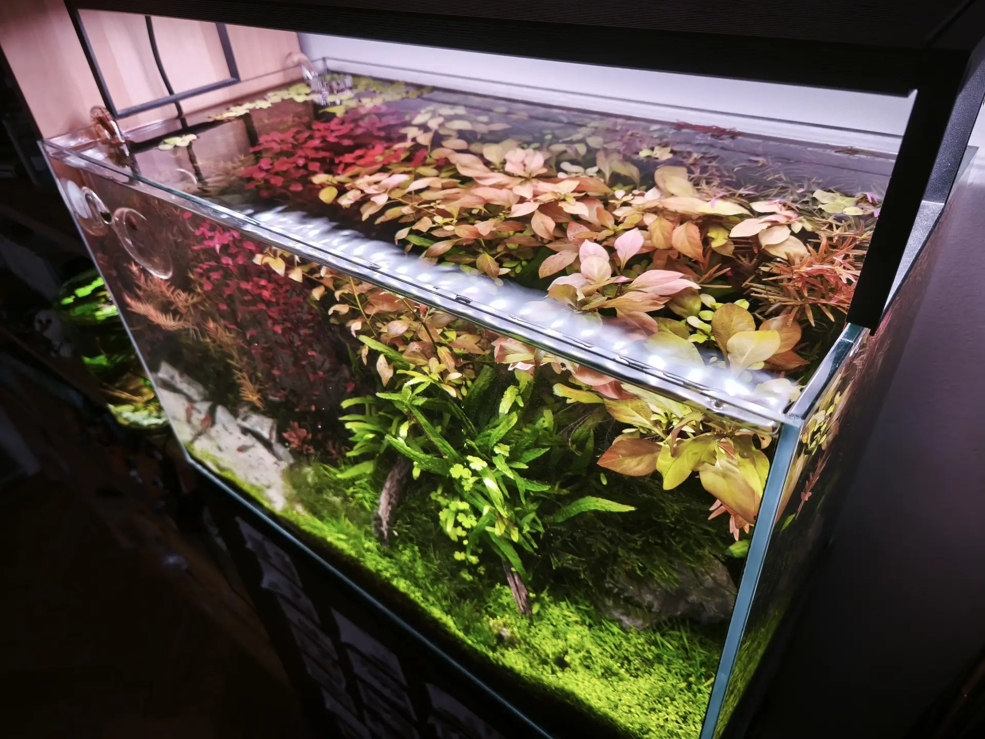 Provedl jsem zástřih ludwigie super red a částečně i nové dark orange. Do levého rohu jsem dosázel rotalu h'ra, aby zakryla skimmer...