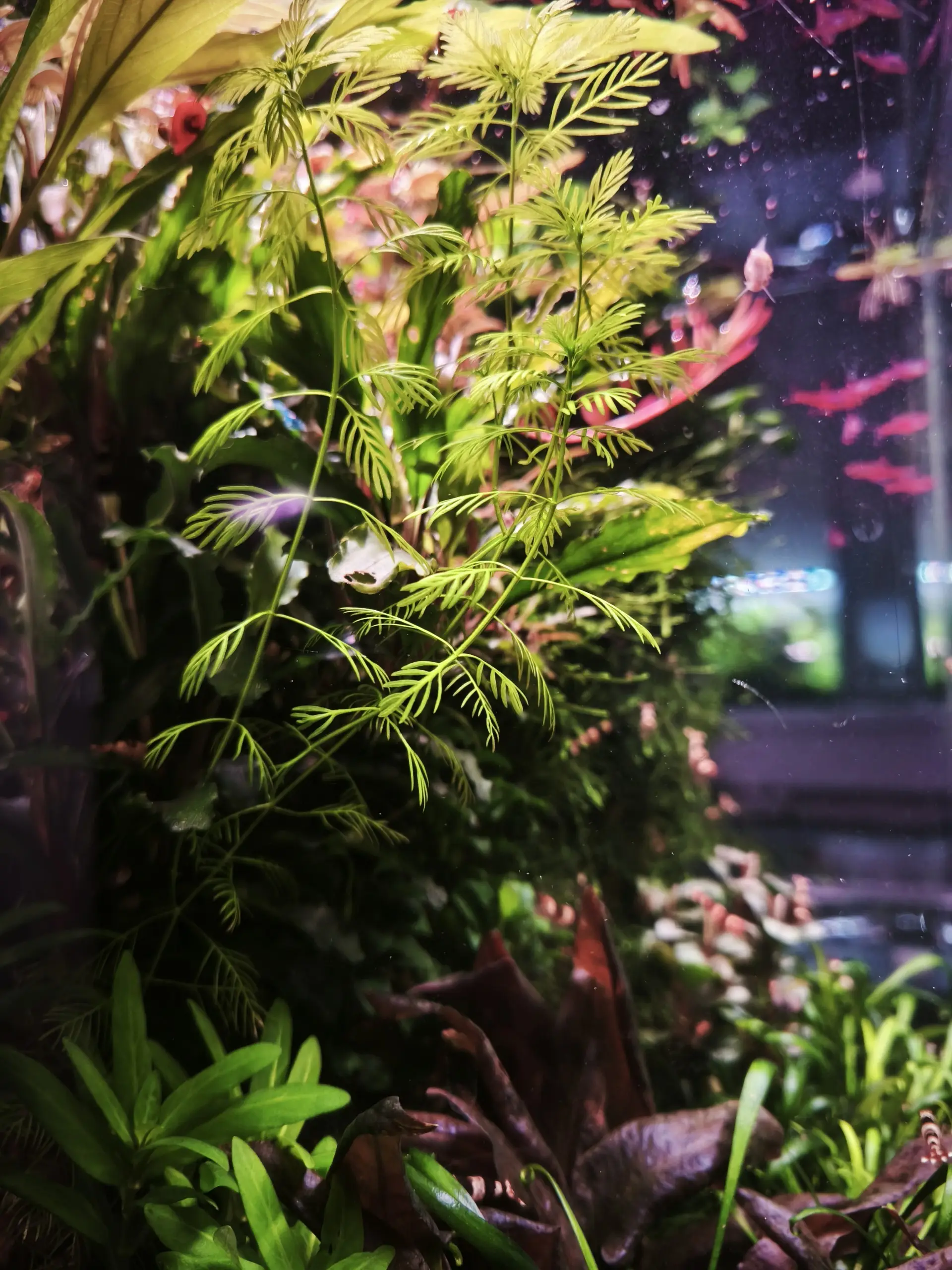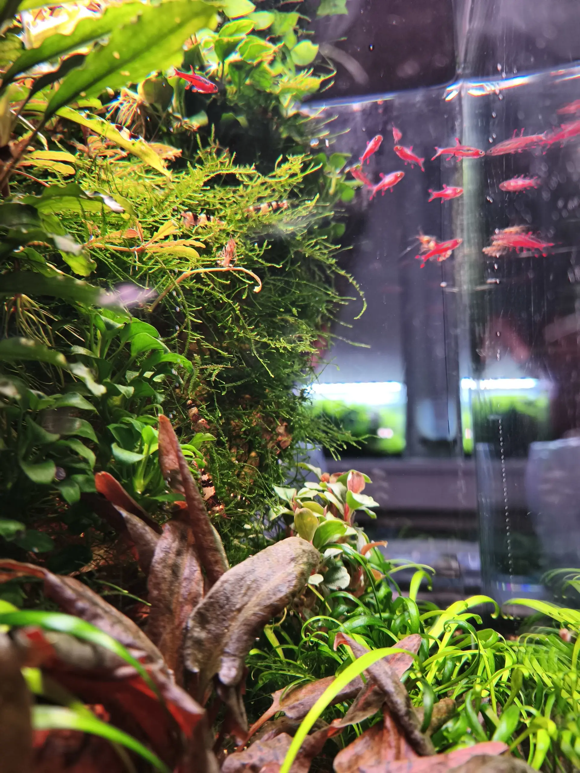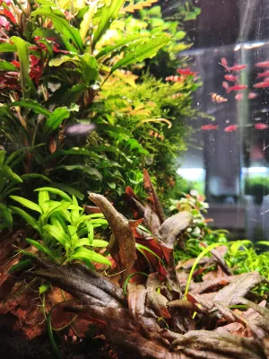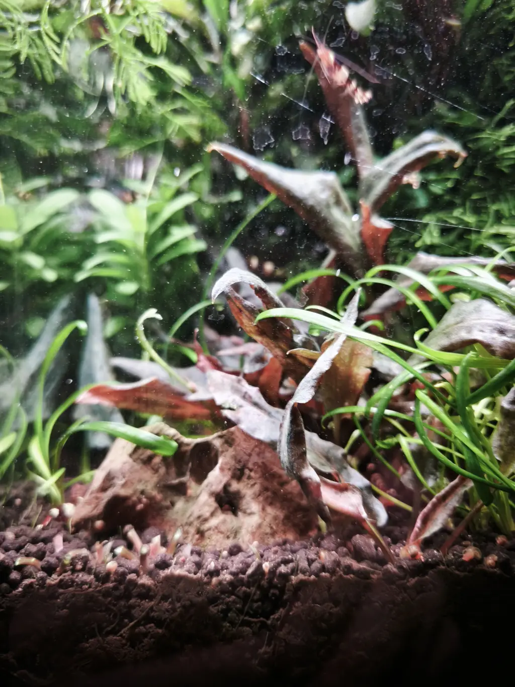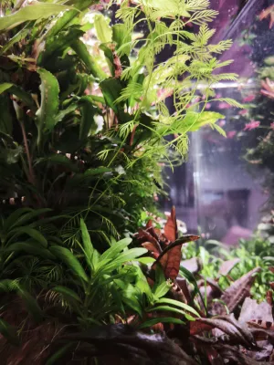 Popis: Na podzim 2023 mi kamarádka nabídla staré nevyužité akvárko Dennerle Nanocube 30l. Bylo/je sice ukrutně poškrábané, ale darovanému koni na zuby nehleď, že. Tady jsem chtěl vytvořit něco na způsob skalního útesu obrostleho bujnou vegetací nad zelenou planinou. Planina bohužel moc dlouho nevydržela, protože jsem zanedbával pravidelné zastřihávání Cuby a celý kobereček se postupně utrhl ode dna. Samovolně ho z větší části postupně nahradila houština z kryptokoryny Parva. Navíc se asi po půl roce při jedné údržbě utrhl útes od základny (asi jsem spoj poddimenzoval a použil málo vaty a lepidla) a opřel se o sklo. Od té doby plánuji, že to celé předélám a víc si s tím vyhraju. Zatím ale zůstalo jen u plánů :-)