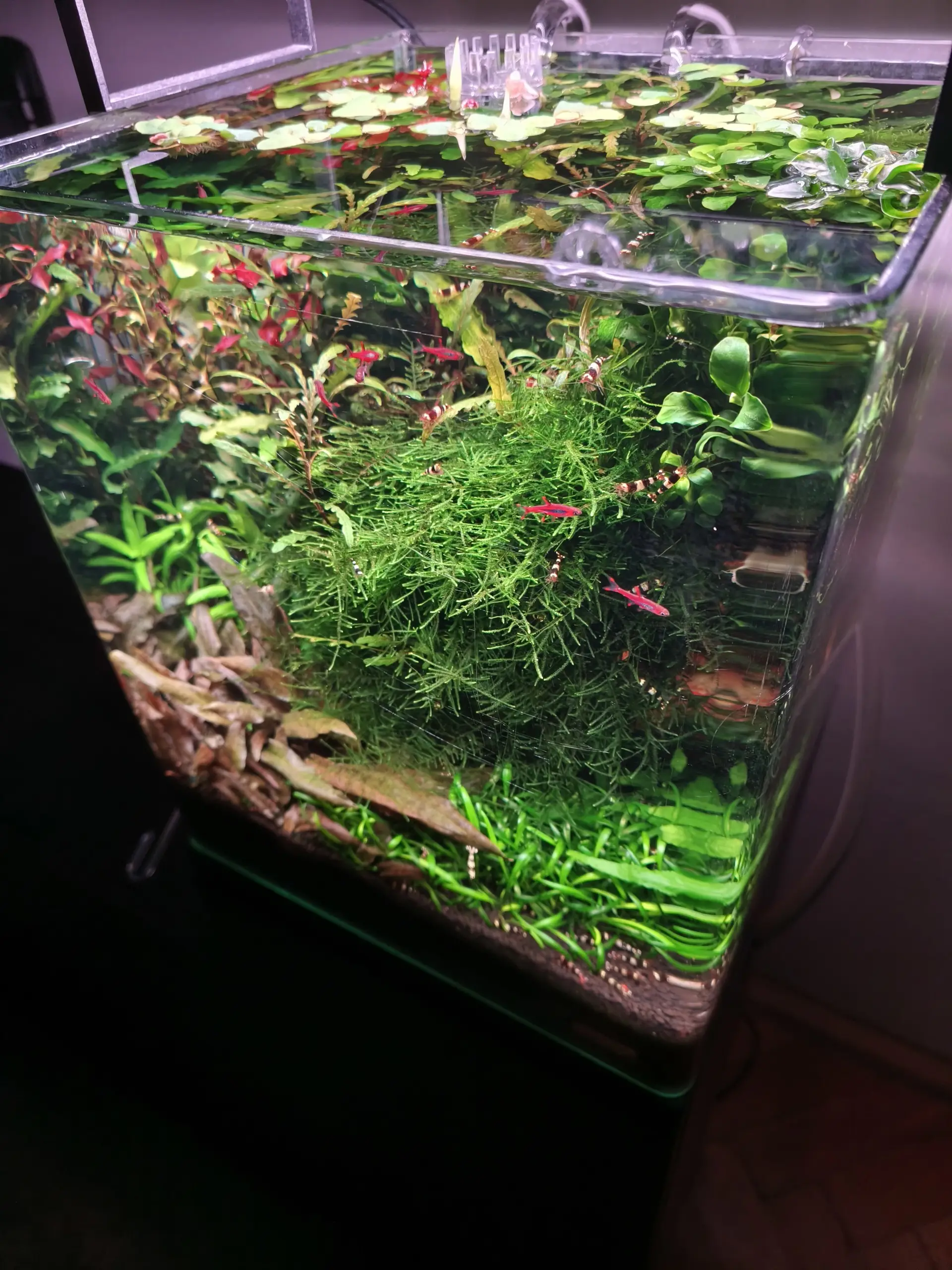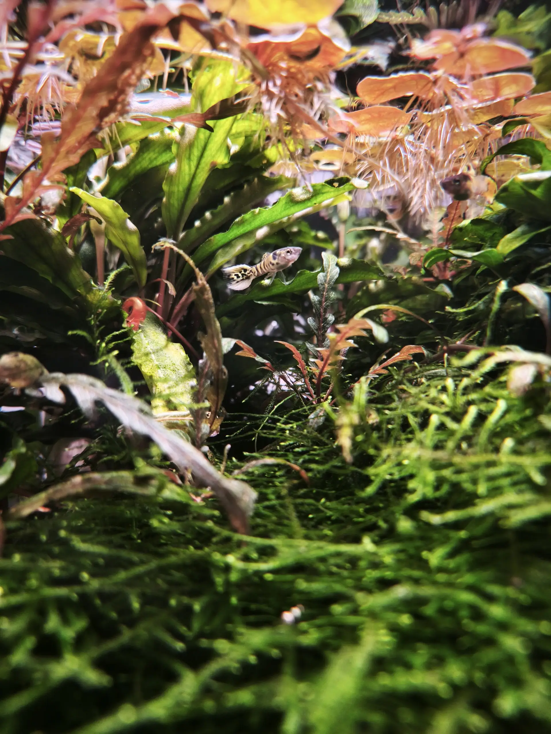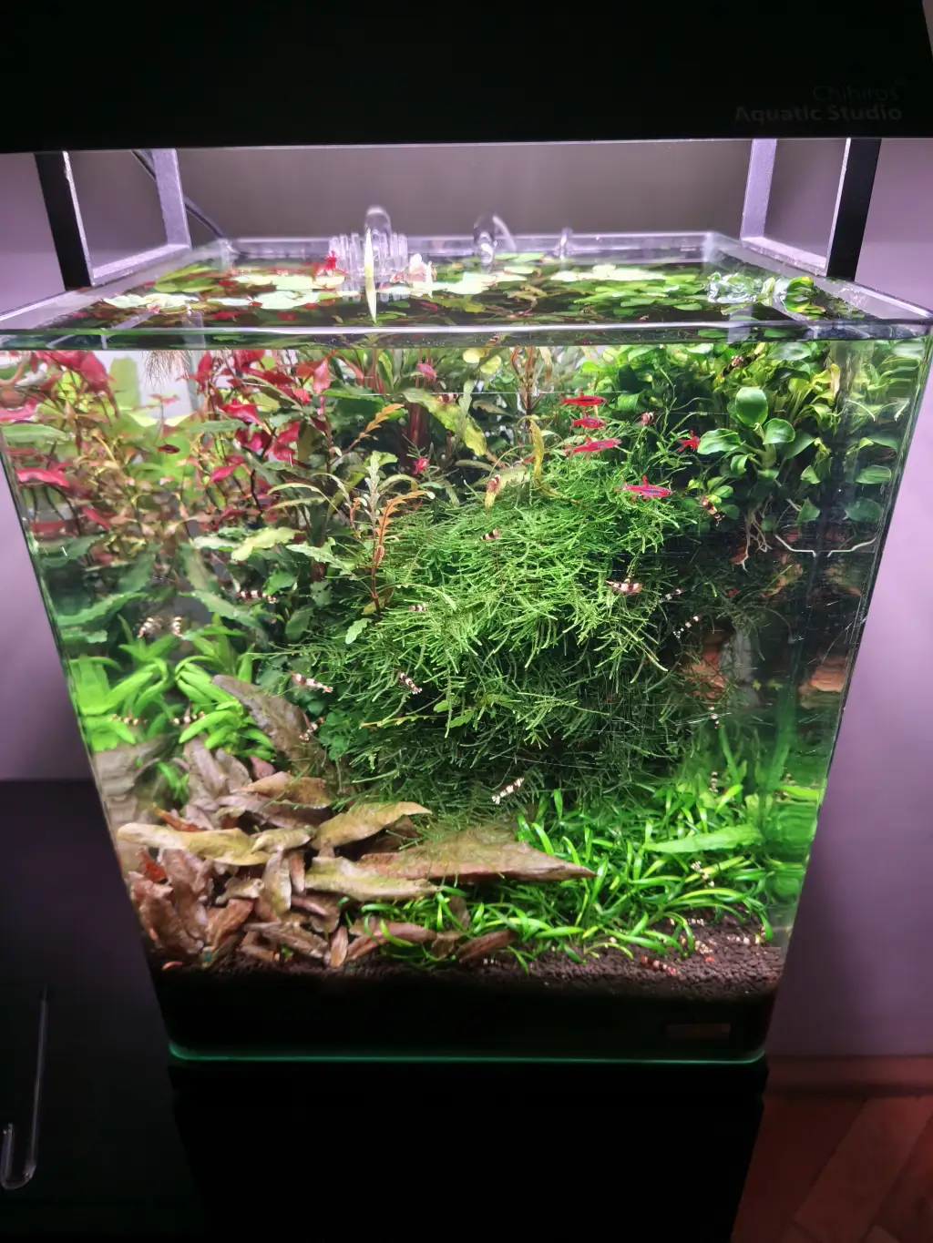 Popis: Na podzim 2023 mi kamarádka nabídla staré nevyužité akvárko Dennerle Nanocube 30l. Bylo/je sice ukrutně poškrábané, ale darovanému koni na zuby nehleď, že. Tady jsem chtěl vytvořit něco na způsob skalního útesu obrostleho bujnou vegetací nad zelenou planinou. Planina bohužel moc dlouho nevydržela, protože jsem zanedbával pravidelné zastřihávání Cuby a celý kobereček se postupně utrhl ode dna. Samovolně ho z větší části postupně nahradila houština z kryptokoryny Parva. Navíc se asi po půl roce při jedné údržbě utrhl útes od základny (asi jsem spoj poddimenzoval a použil málo vaty a lepidla) a opřel se o sklo. Od té doby plánuji, že to celé předélám a víc si s tím vyhraju. Zatím ale zůstalo jen u plánů :-)