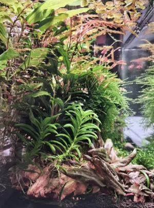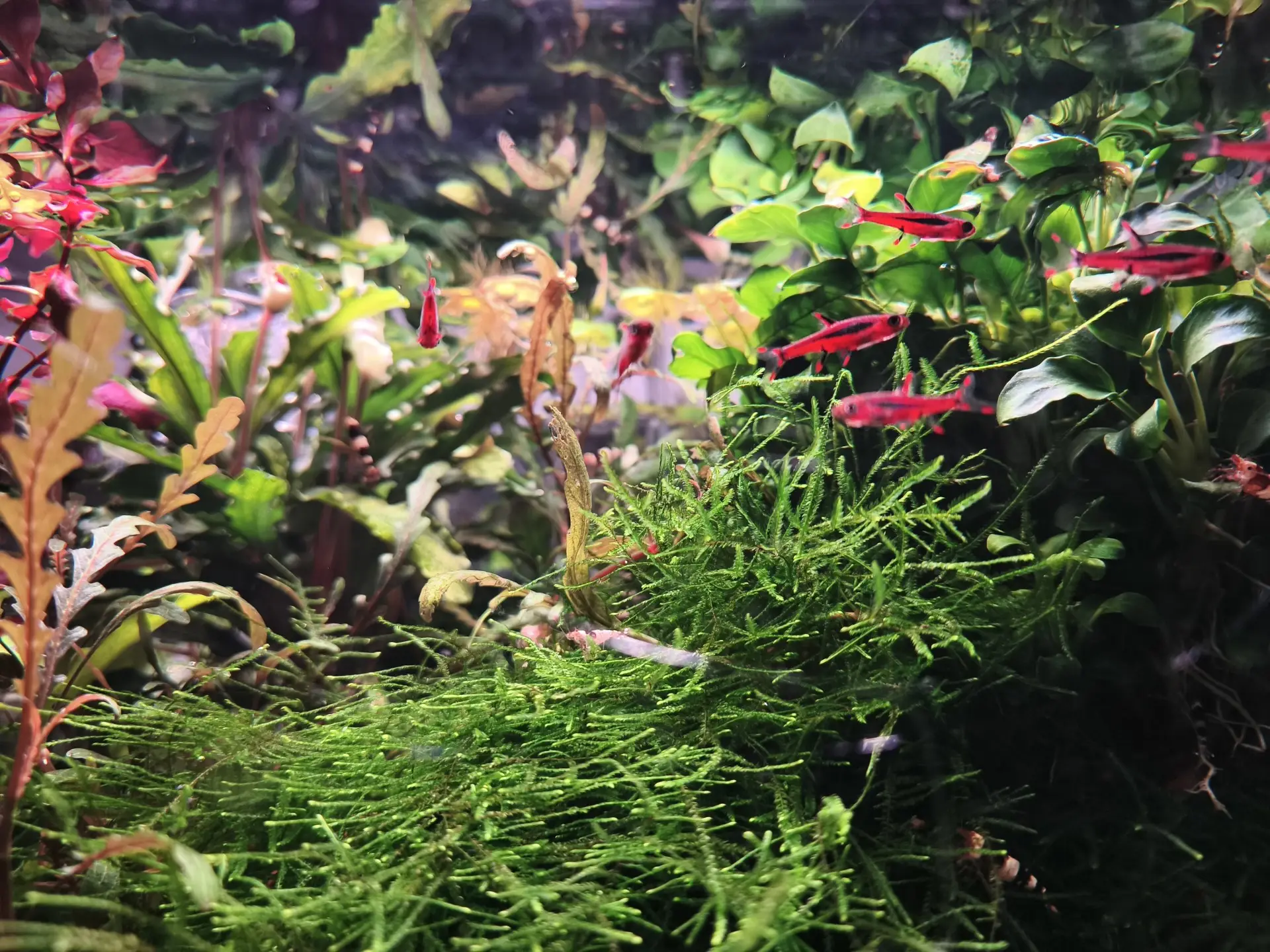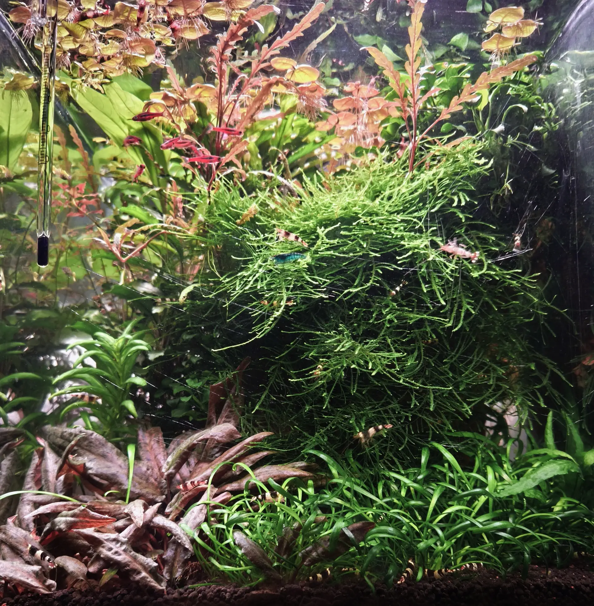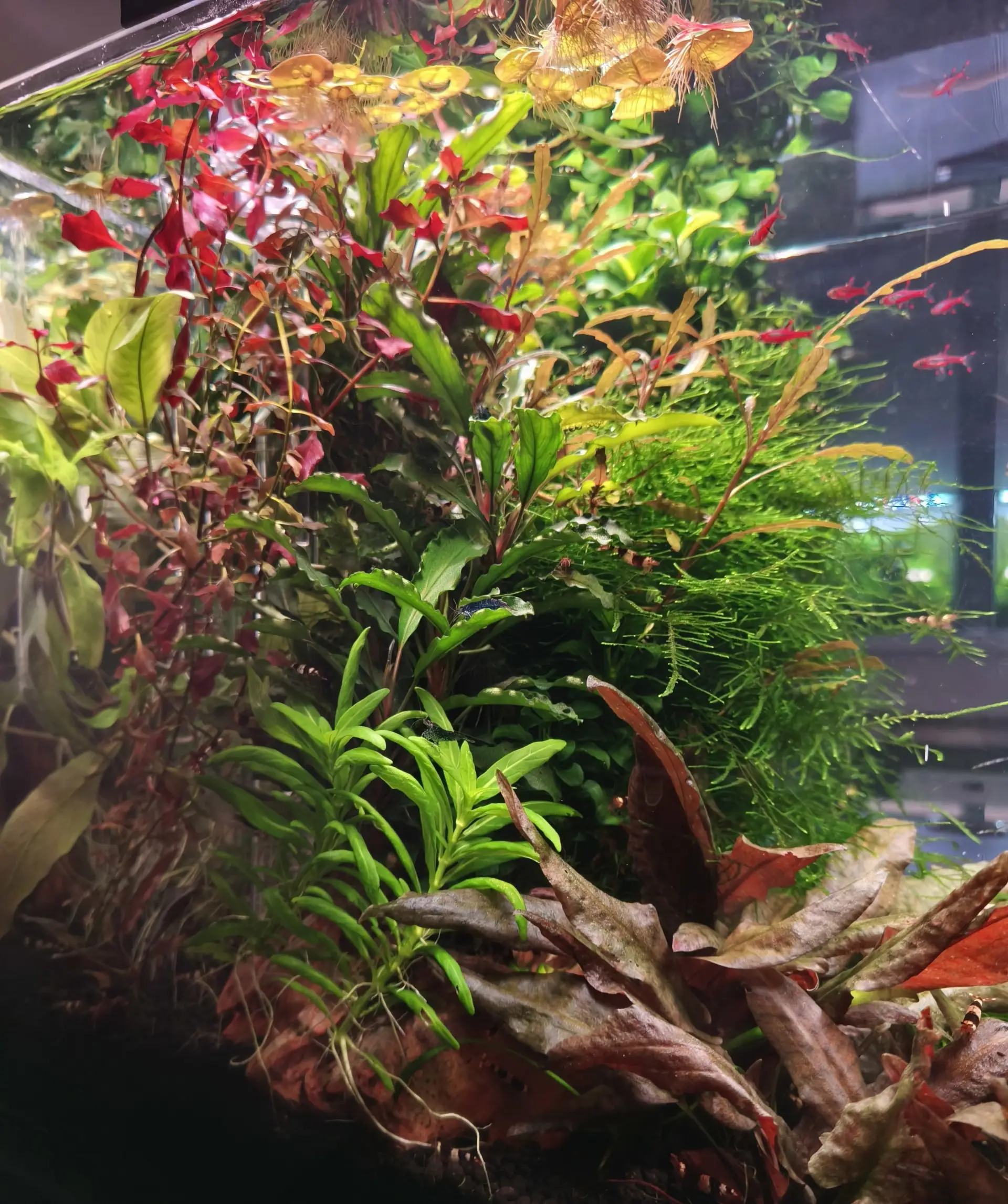 Popis: Na podzim 2023 mi kamarádka nabídla staré nevyužité akvárko Dennerle Nanocube 30l. Bylo/je sice ukrutně poškrábané, ale darovanému koni na zuby nehleď, že. Tady jsem chtěl vytvořit něco na způsob skalního útesu obrostleho bujnou vegetací nad zelenou planinou. Planina bohužel moc dlouho nevydržela, protože jsem zanedbával pravidelné zastřihávání Cuby a celý kobereček se postupně utrhl ode dna. Samovolně ho z větší části postupně nahradila houština z kryptokoryny Parva. Navíc se asi po půl roce při jedné údržbě utrhl útes od základny (asi jsem spoj poddimenzoval a použil málo vaty a lepidla) a opřel se o sklo. Od té doby plánuji, že to celé předélám a víc si s tím vyhraju. Zatím ale zůstalo jen u plánů :-)