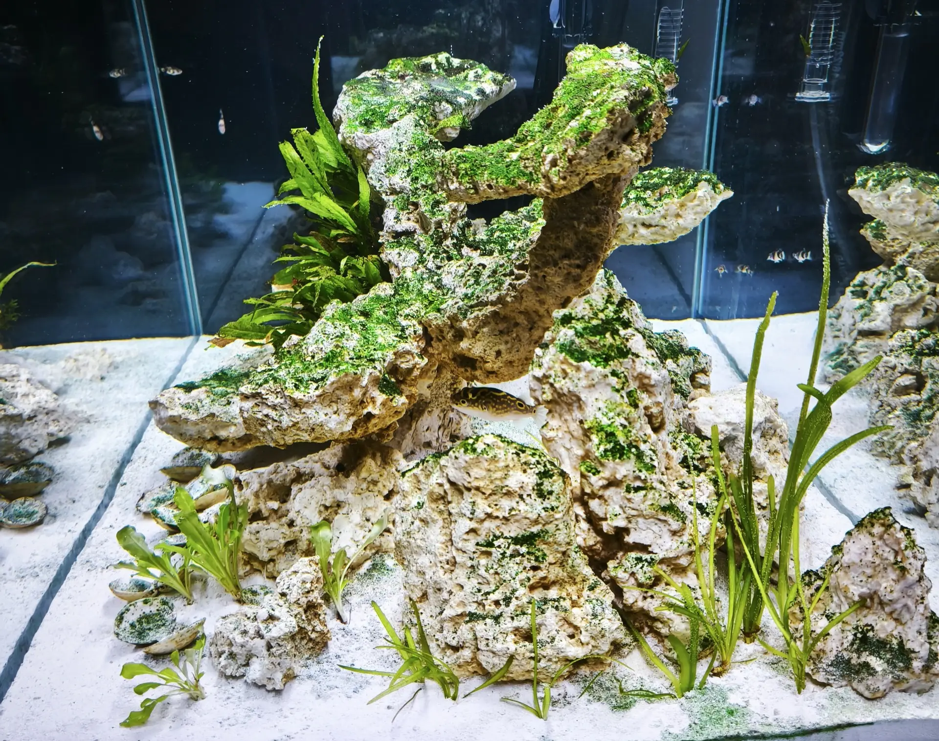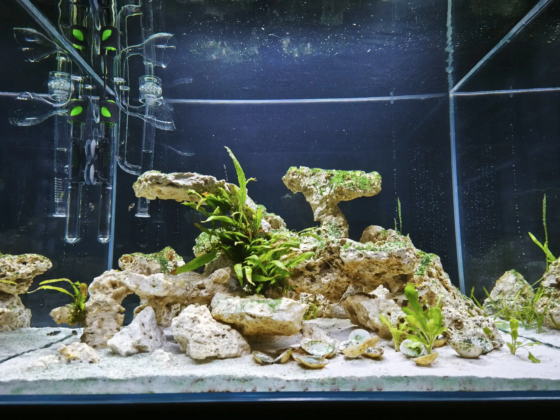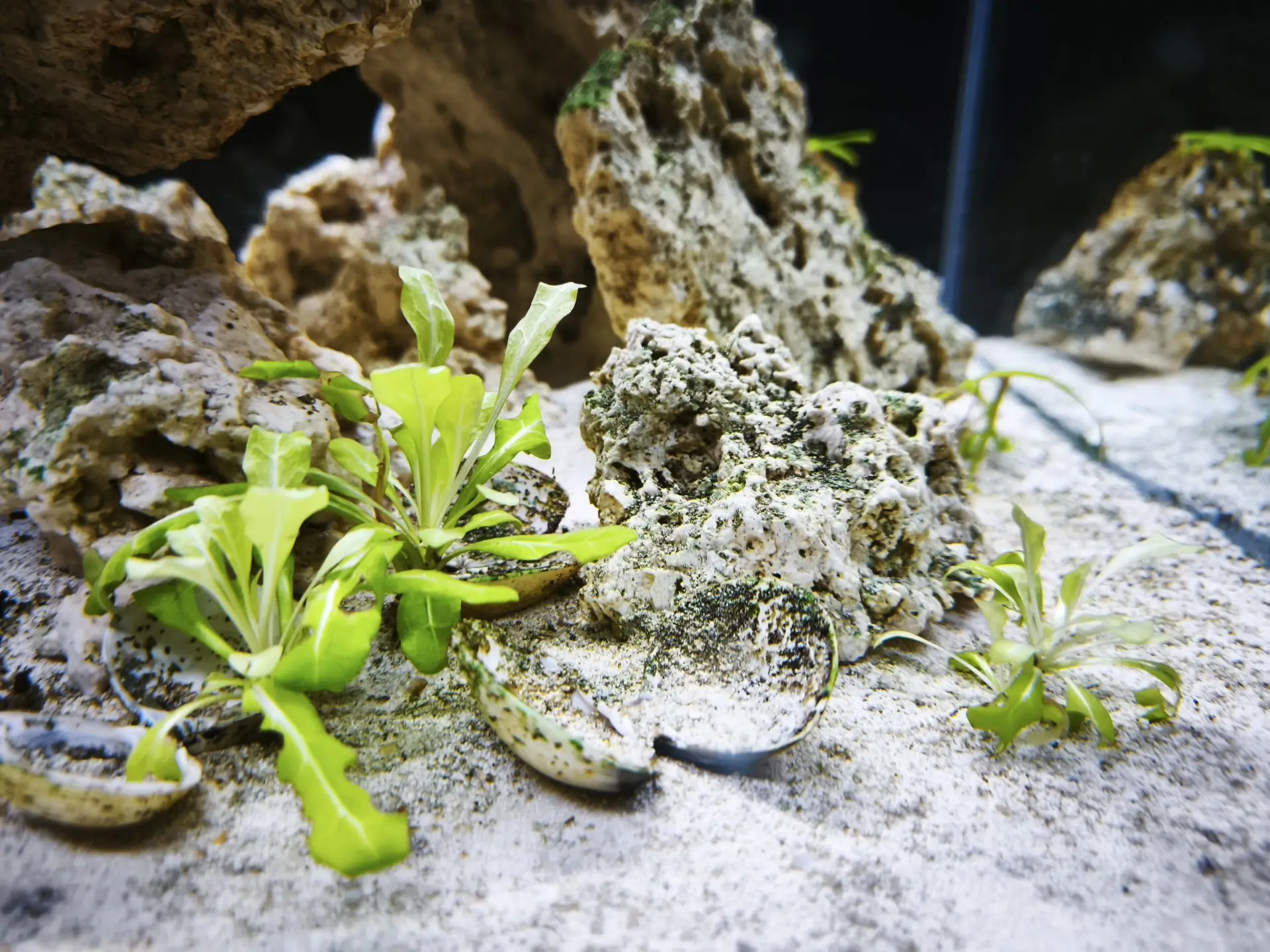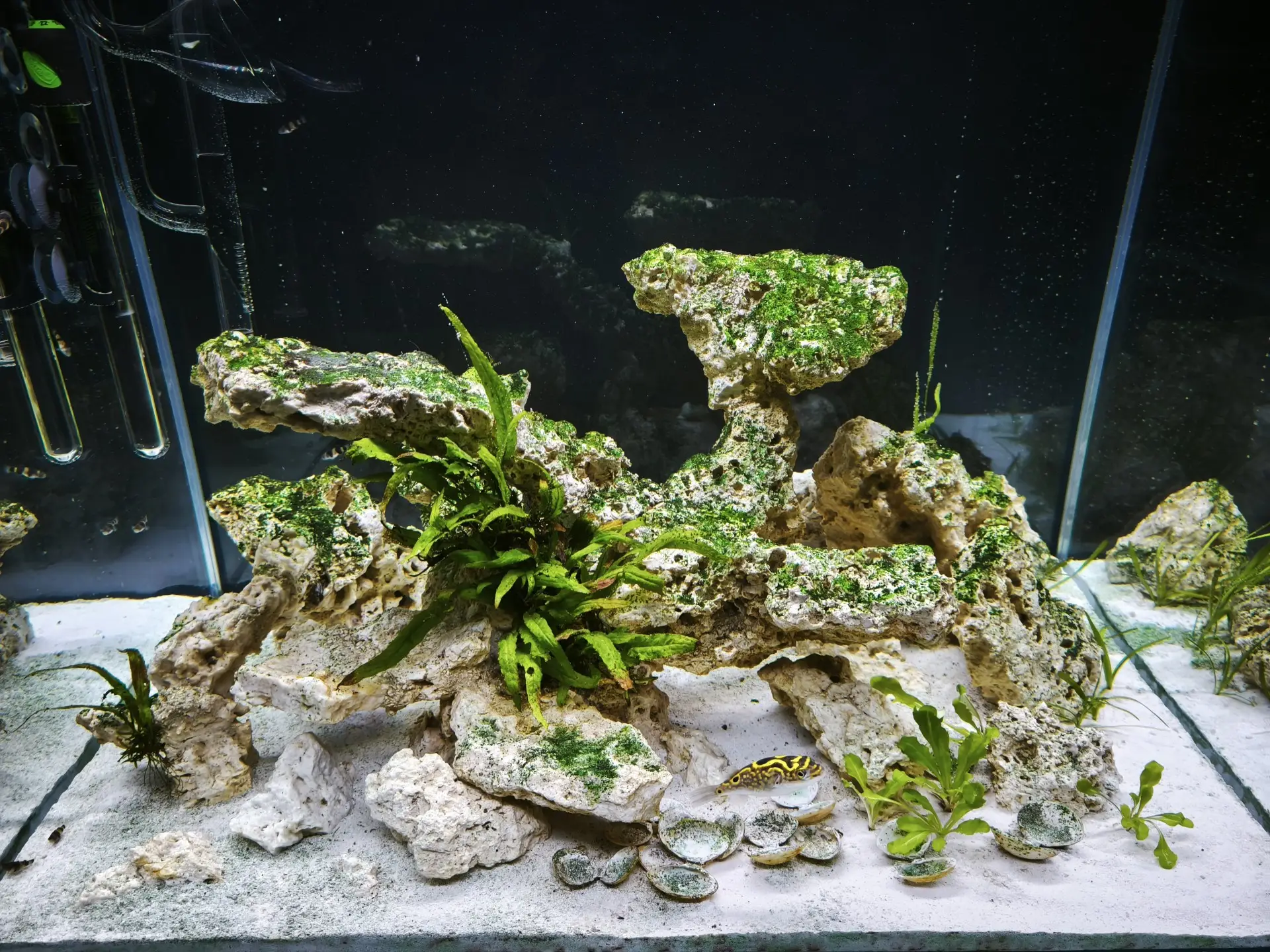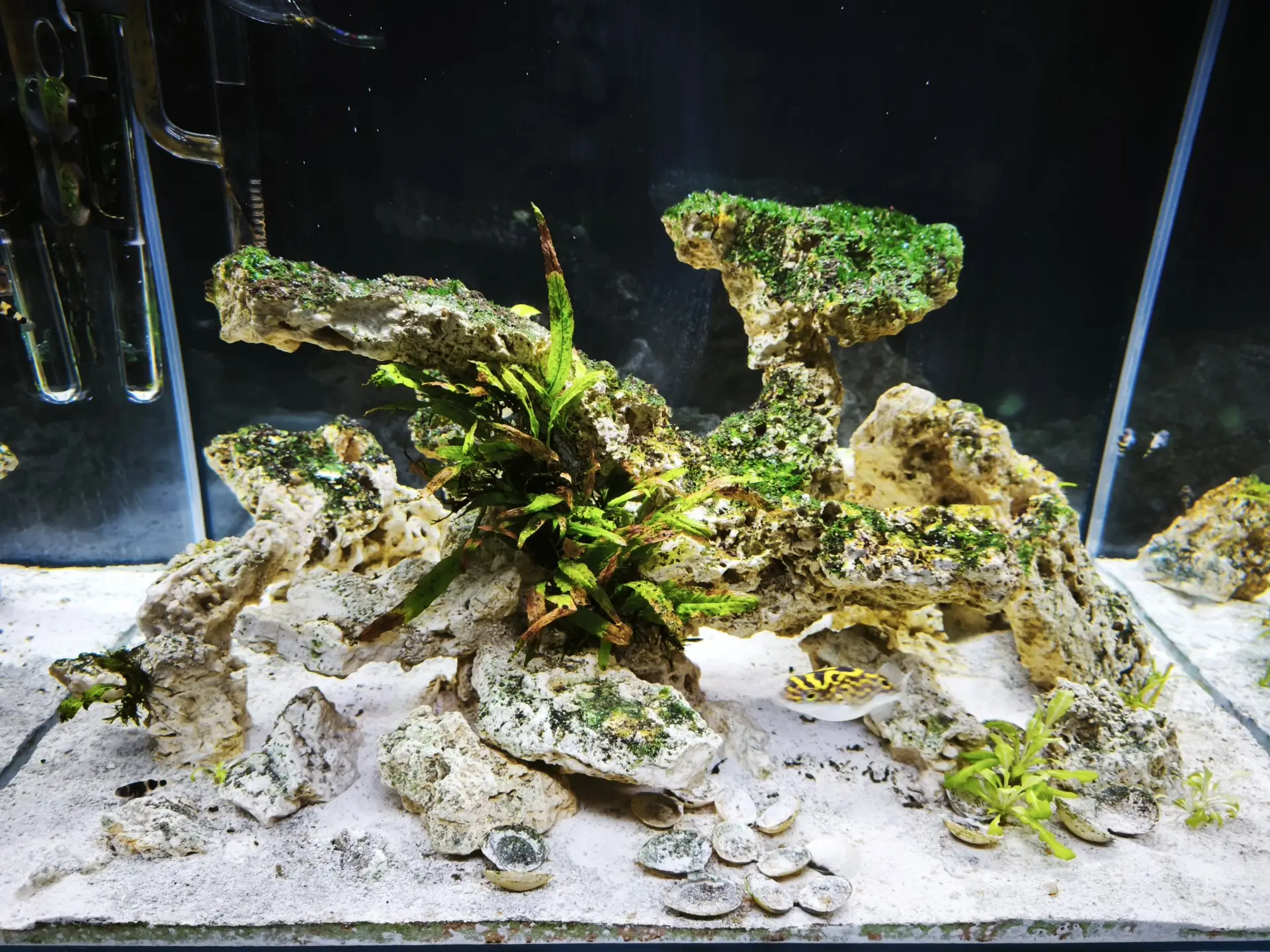 Dekorace: Arka myReef rocks 20 kg M 13-20 cm slepené pomocí super řídkého vteřinového lepidla a jemné drti do jakéhosi pokusu o NSA (Negative Space Aquascape)