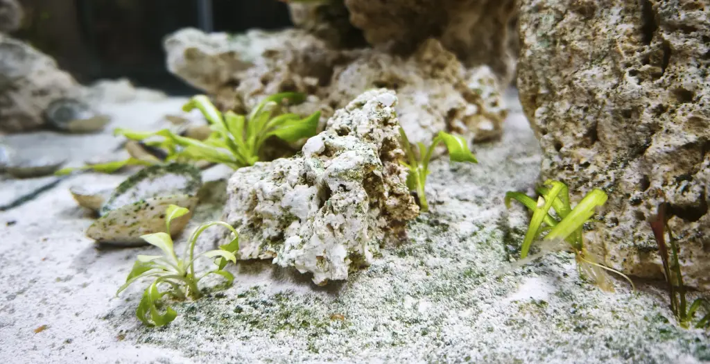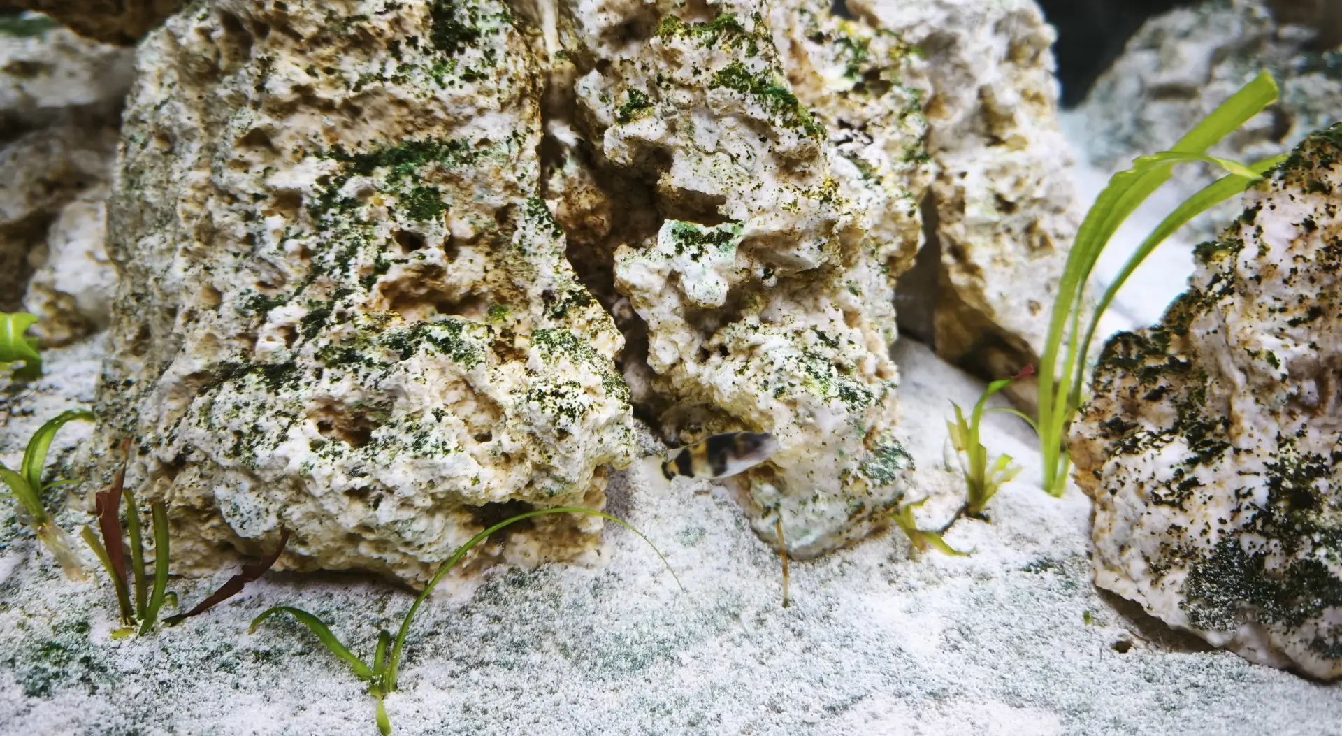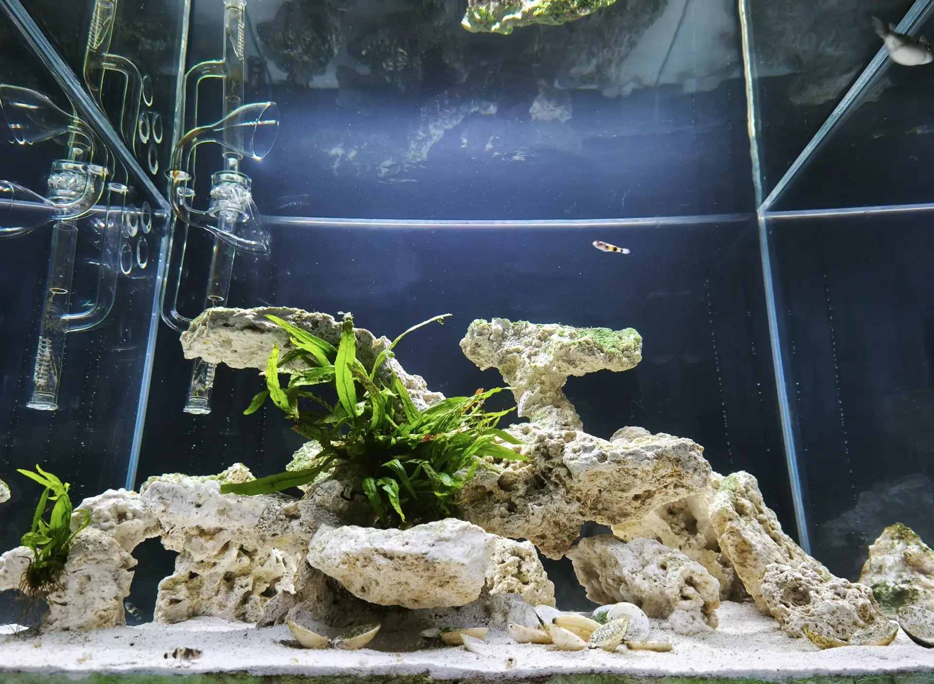 Dno: 9kg Seachem Meridian (aragonitový jemný písek) + 9kg živého písku.