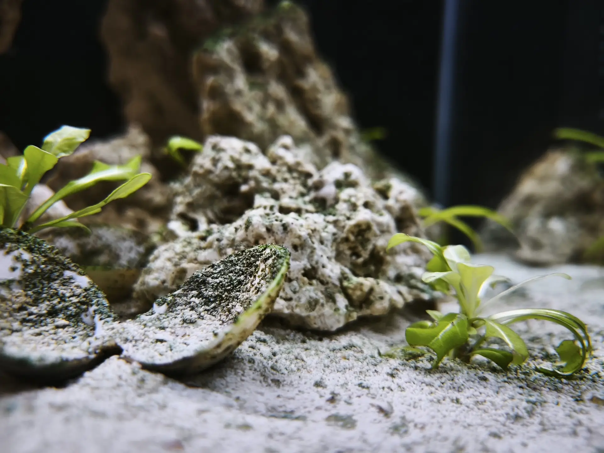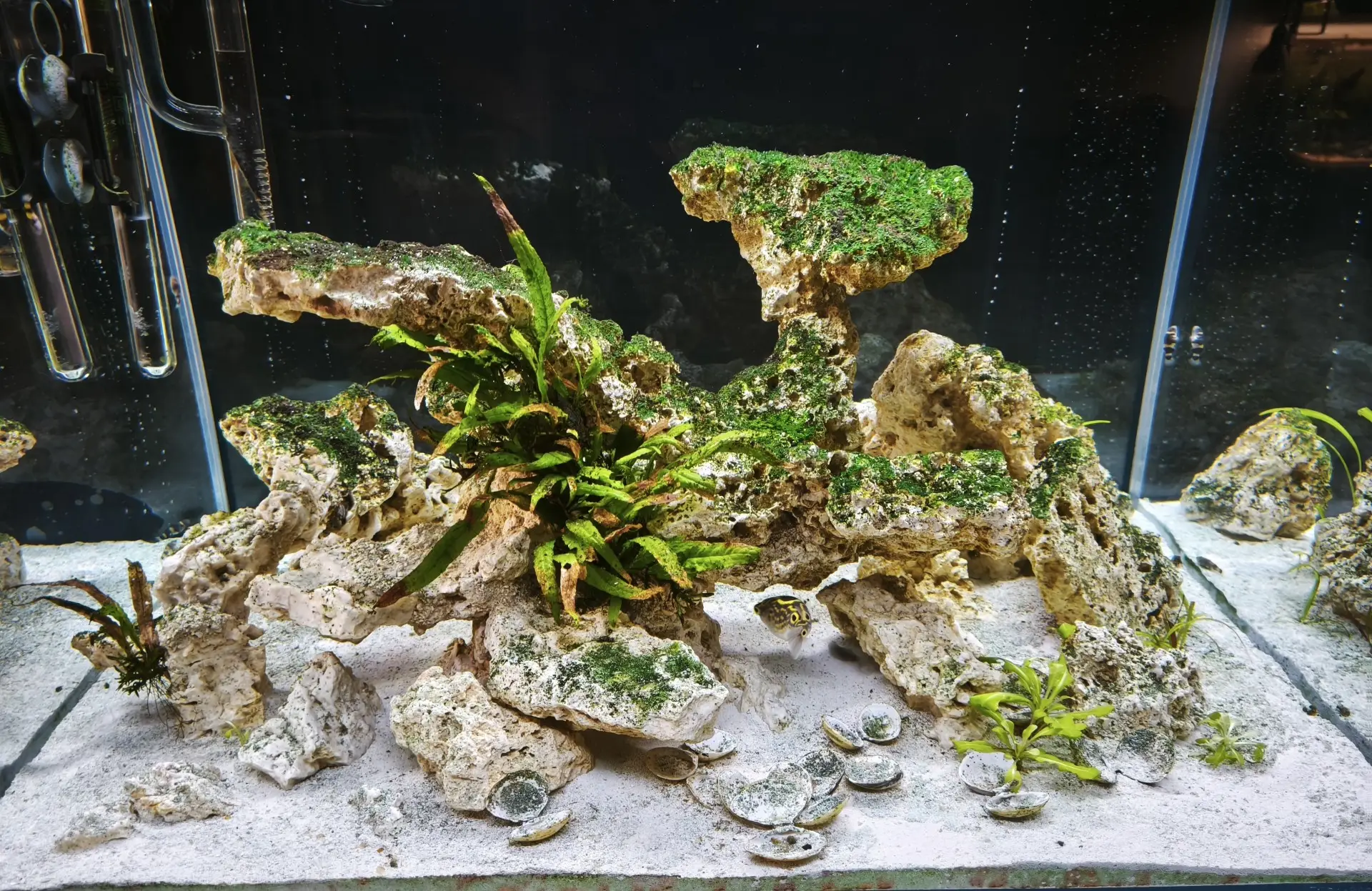 Dekorace: Arka myReef rocks 20 kg M 13-20 cm slepené pomocí super řídkého vteřinového lepidla a jemné drti do jakéhosi pokusu o NSA (Negative Space Aquascape)