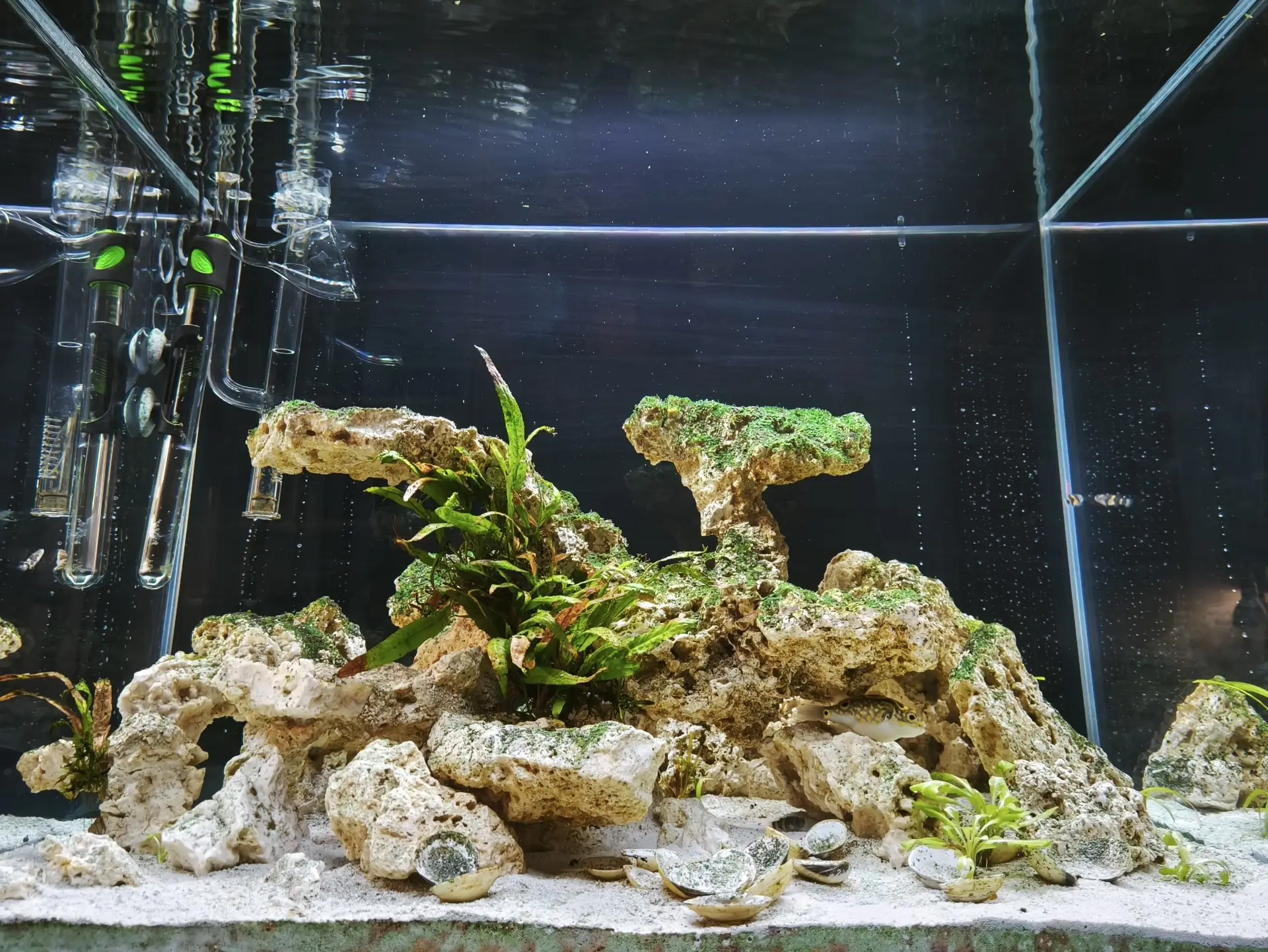 Od té doby jsem pročetl hodně článků a diskuzí na převážně zahraničních stránkách a fórech (třeba výborné www.thepufferforum.com). Naprostá většina majitelů "Green Spotted Puffers" je chová v brakické až mořské vodě o specifické hustotě 1.005-1.025 (až cca 35g soli na litr vody). Njn, chybami se člověk učí...