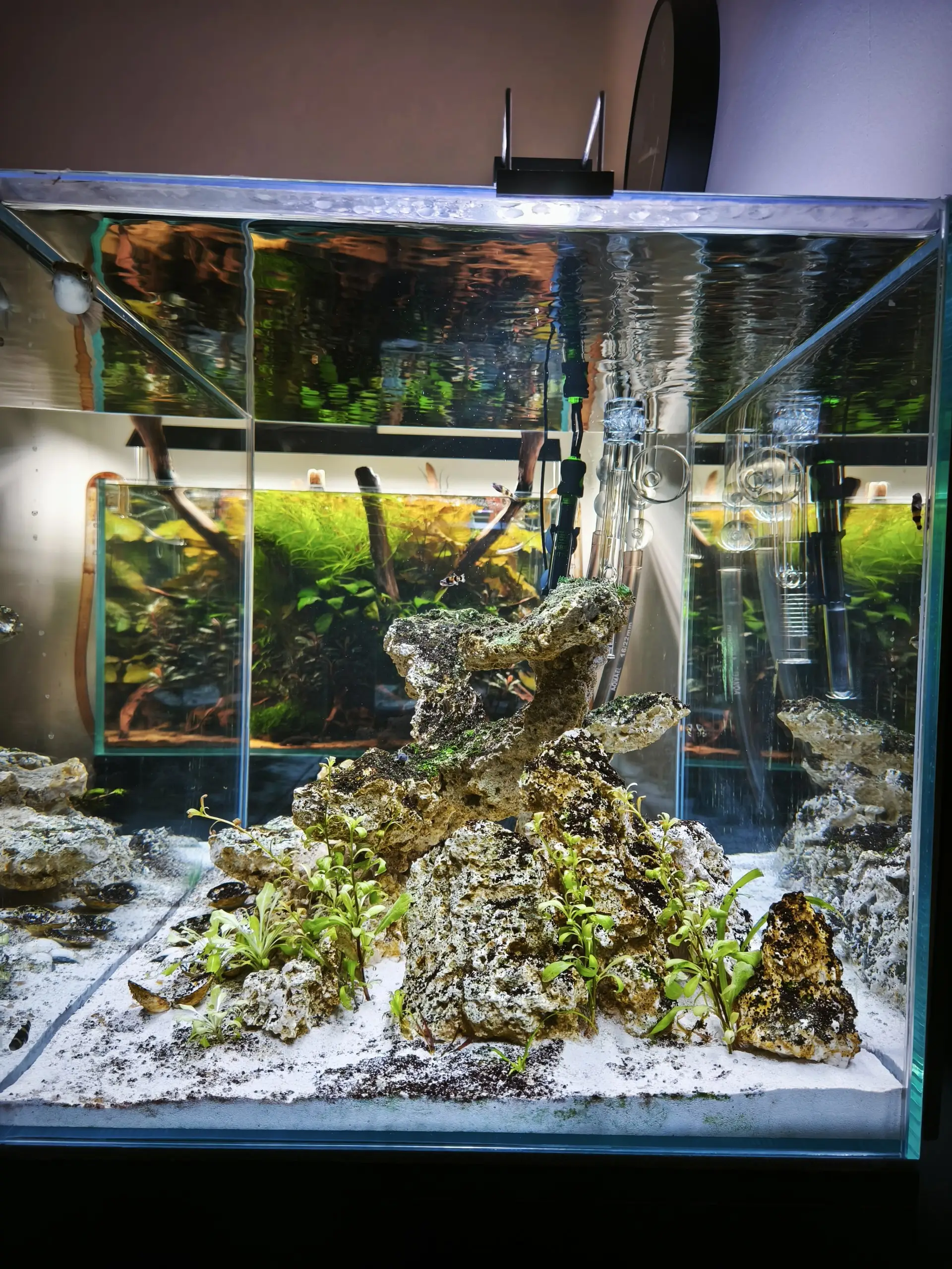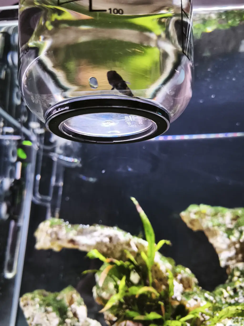 Poznámka: Kvůli čtverzubcovým skokanským dovednostem (viz deník z 27.3.2025) je akvárium zakryto čirým 5mm plexisklem.