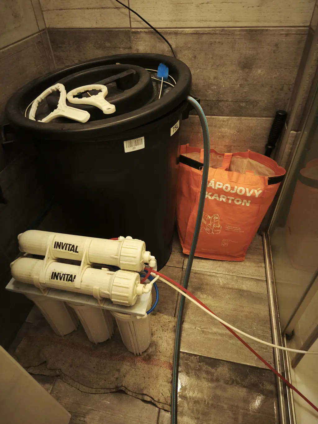 Vždycky postupuji tak, že si nejdřív zajdu do barelu pro RODI vodu a v 10 litrovém kýblu rozmíchám tři hrnky mořské soli. Hned po odebrání těch deseti litrů ale zapínám osmózu, abych doplnil ten úbytek vody, než začnu napouštět akvárium. Potom se jdu věnovat údržbě, očistit skla, ostříhat odumřelé listy hnědovky a odkalit. Když jsem přišel vylít první dvacetilitrový kýbl, koukám že v koupelně je velká louže vody a tentokrát to není přetékajícím barelem (jak už se mi v minulostí párkrát povedlo), ale protékající osmózou. Jak jsem později po vytření podlahy zjistil, po dvou a půl letech bezproblémového provozu se trochu povolila poslední patrona s DI filtrem. Naštěstí tedy stačilo jen najít originální klíč a znovu to fest dotáhnout.