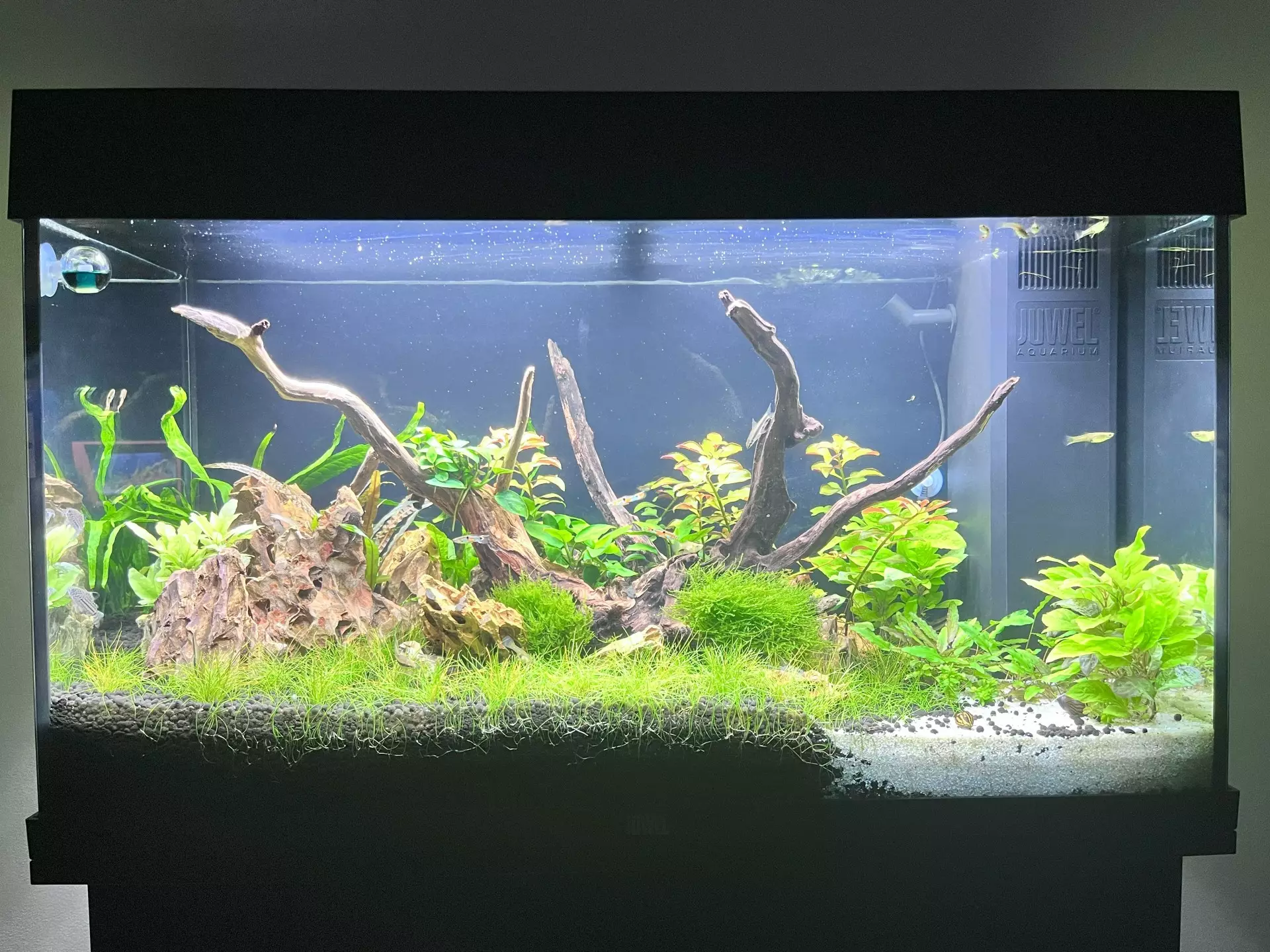 Popis: Juwel Rio 125, vybavení zatím setové, uvidíme co bude potřeba a jak to bude bavit :) Akvárium jsem neměl cca 20 let, tak to beru jako takový pokus. Co se týče úpravy vody, bakterií do začátku apod., tak používám přípravky od Seachemu (stability, prime, ...)