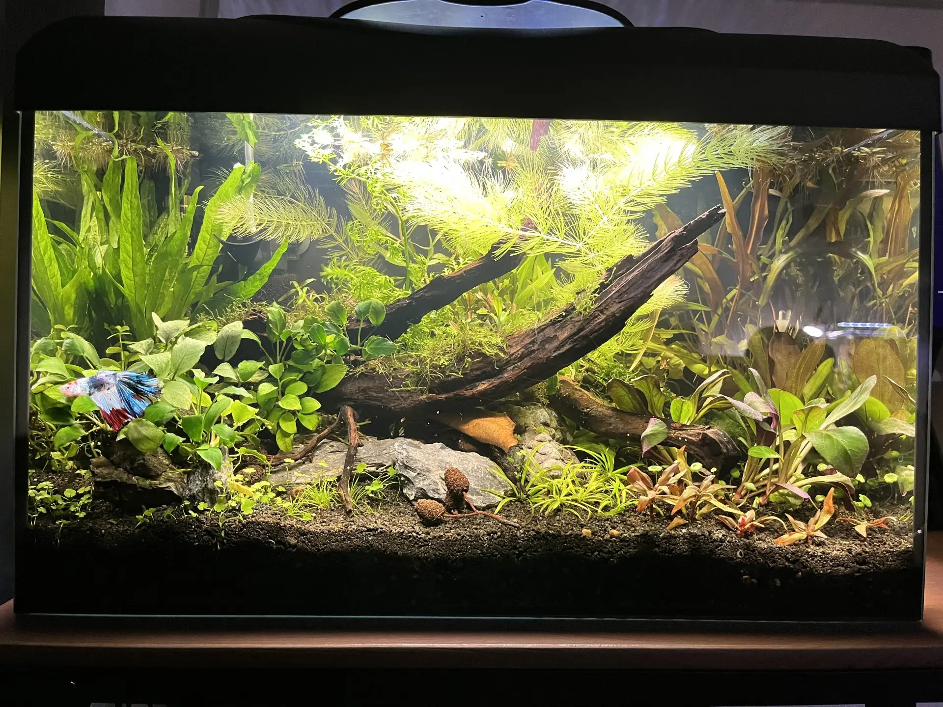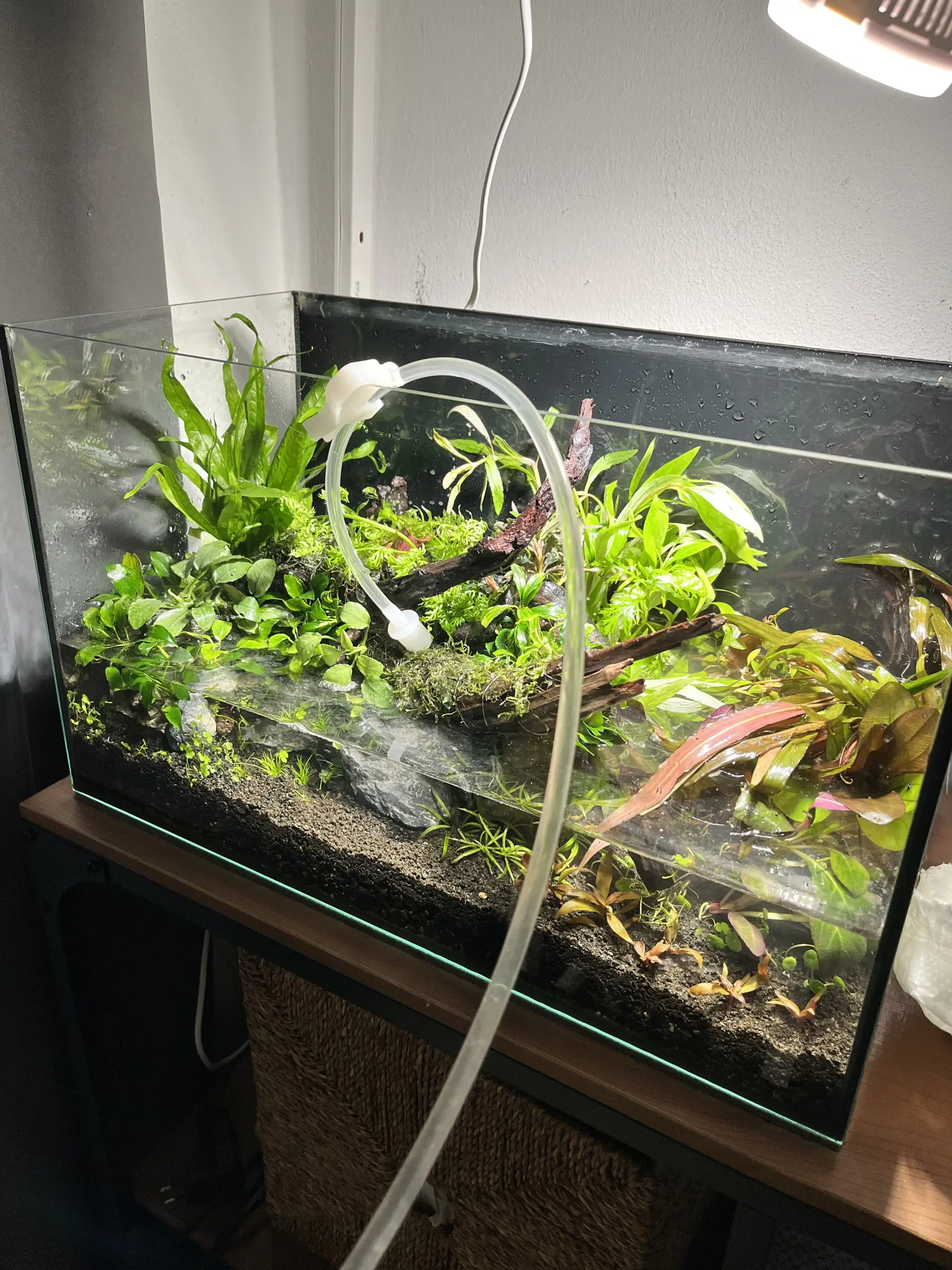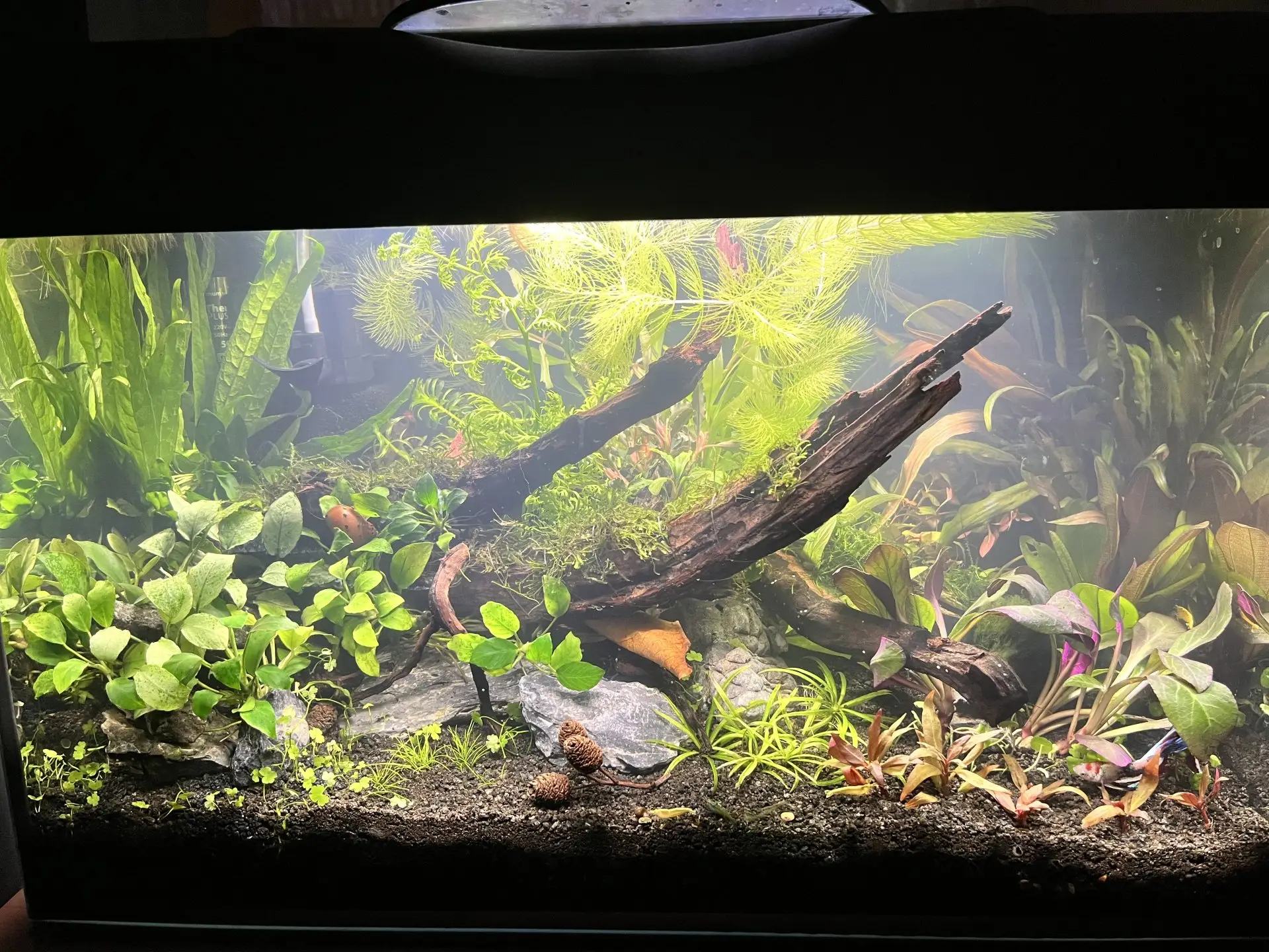 12 10.2025 | Provedena kompletní změna akvária. Měnila jsem i dno. Kytkám se moc nedařilo, bylo to tam naplacane kde se dalo a rostliny vzadu byly velmi smutné nebo skoro neexistující. Měnila jsem i dno. Vrchní substrát jsem nechala a doplnila o nový volcano. |
