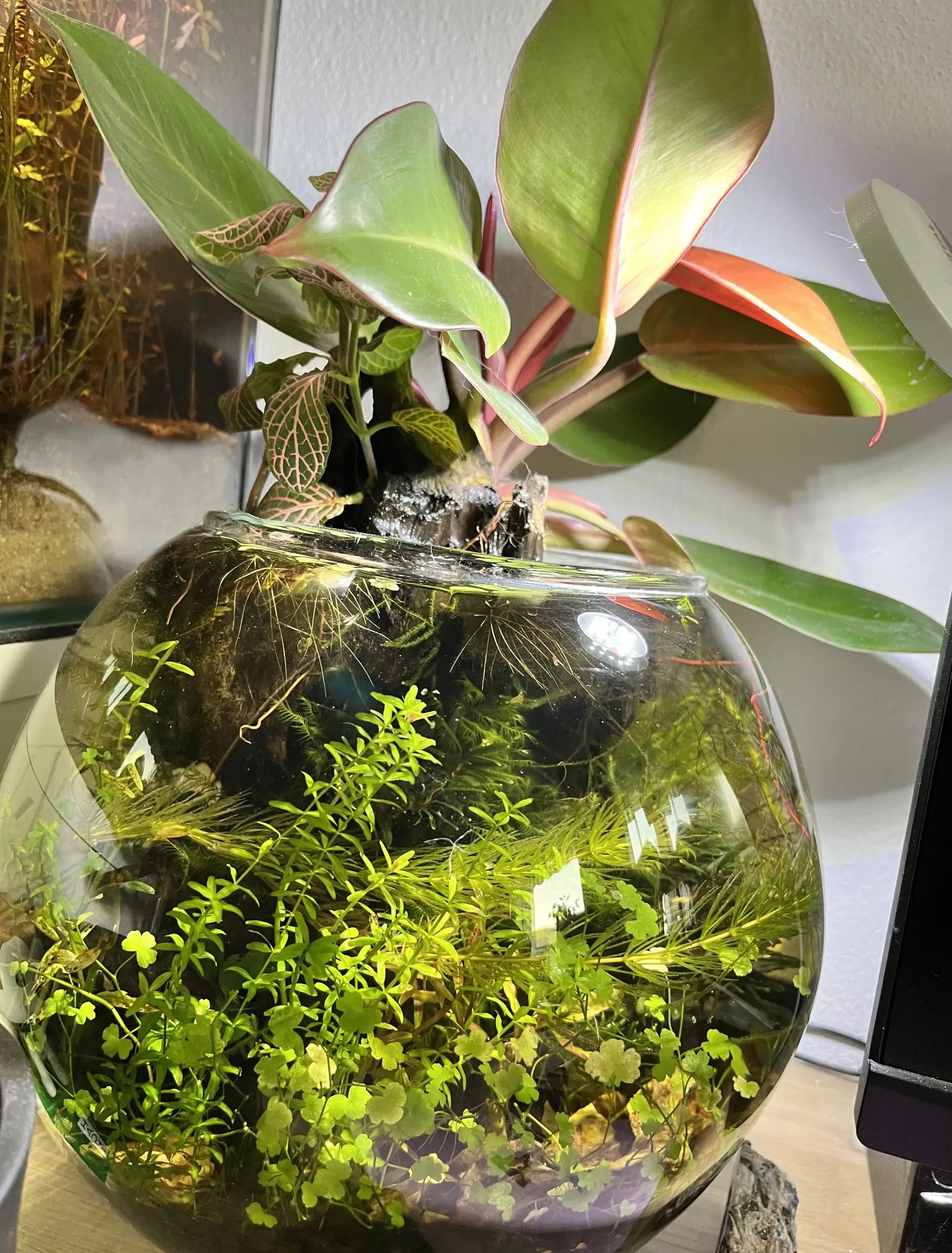 Popis: Koule na stůl k počítači, bez techniky. Rostlinky, světlo. Odchov wild type krevetek, aktuálně 6ks a okružáci