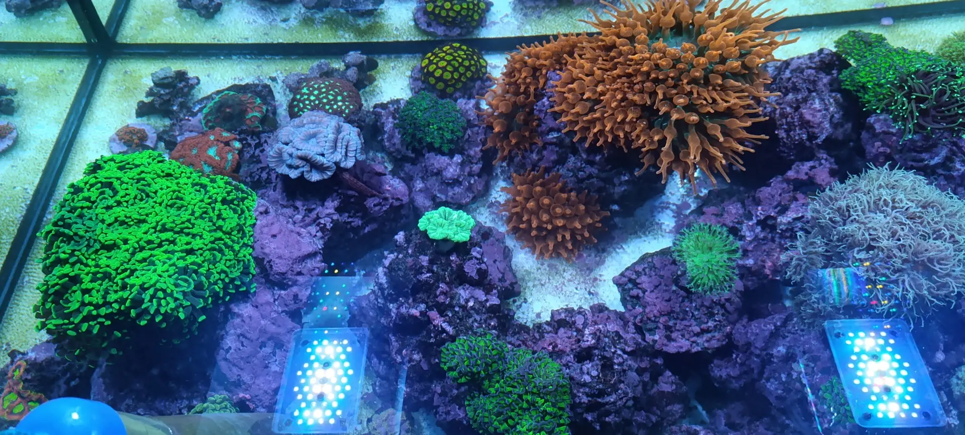 Osvětlení: 3x Radion XR15 blue + DIY rampy na dosvícení krajů nádrže. Zatím jsem měl vždy doma dělaná světla, vše pod tím bez problémů rostlo, ale měl jsem možnost vidět stejnou nádrž pod mým a pod Radionem a rozdíl to je.