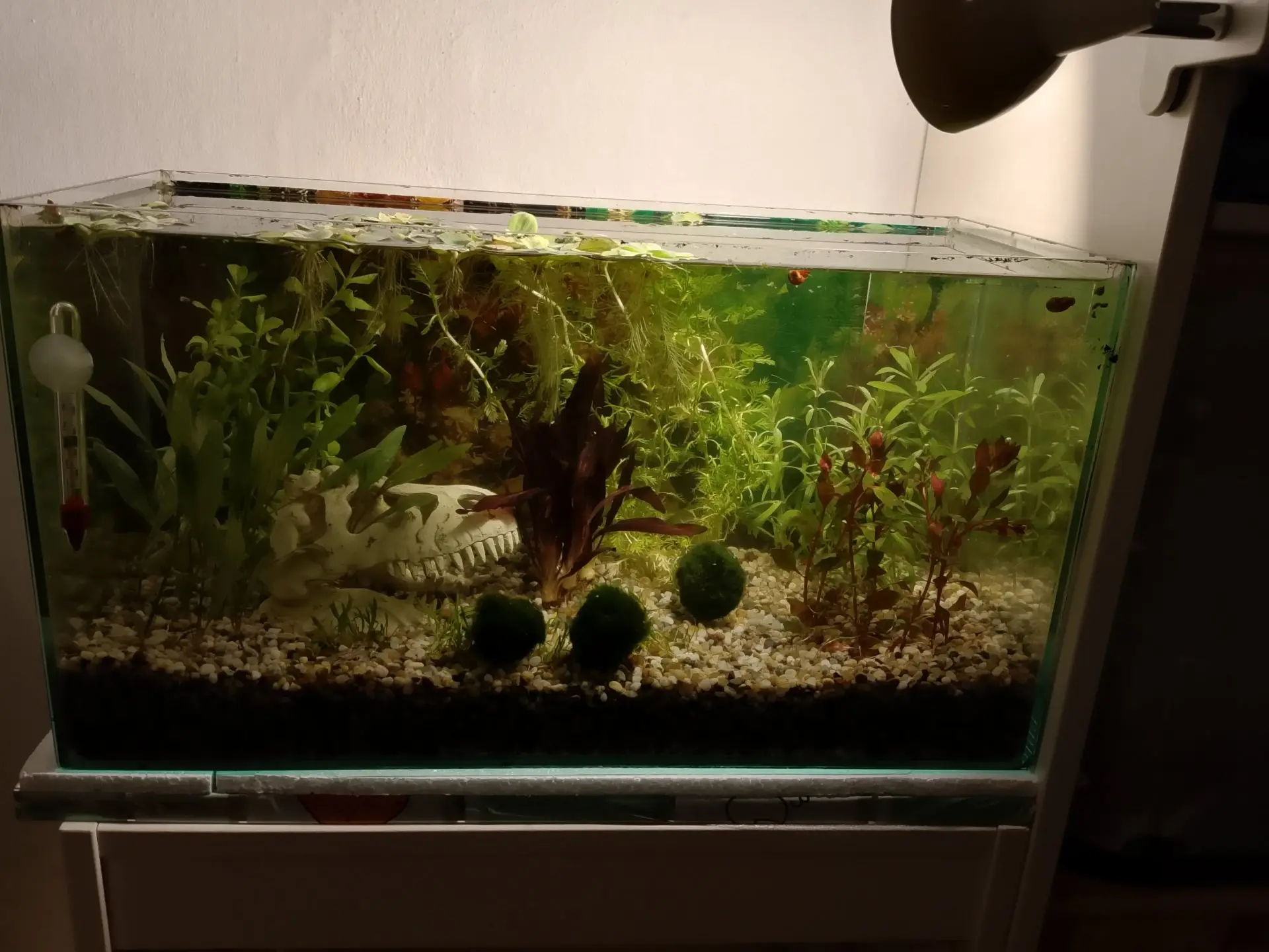 vhodných pro začínající akvaristy do malého akvária. Haha! Takže dnes jsme vylovili babelky do vaničky od masa, přidali řasokoule a ryby, s tím že ve 3cm vody 4 endleráci chvíli vydrží. Odstranili jsme lemnu, syn vypucoval lebku a kameny od řas, a já mezitím velkým zvonem odkalila dno. Zůstalo nad pískem nějakých 7cm vody. To unesu. Podruhé haha. |