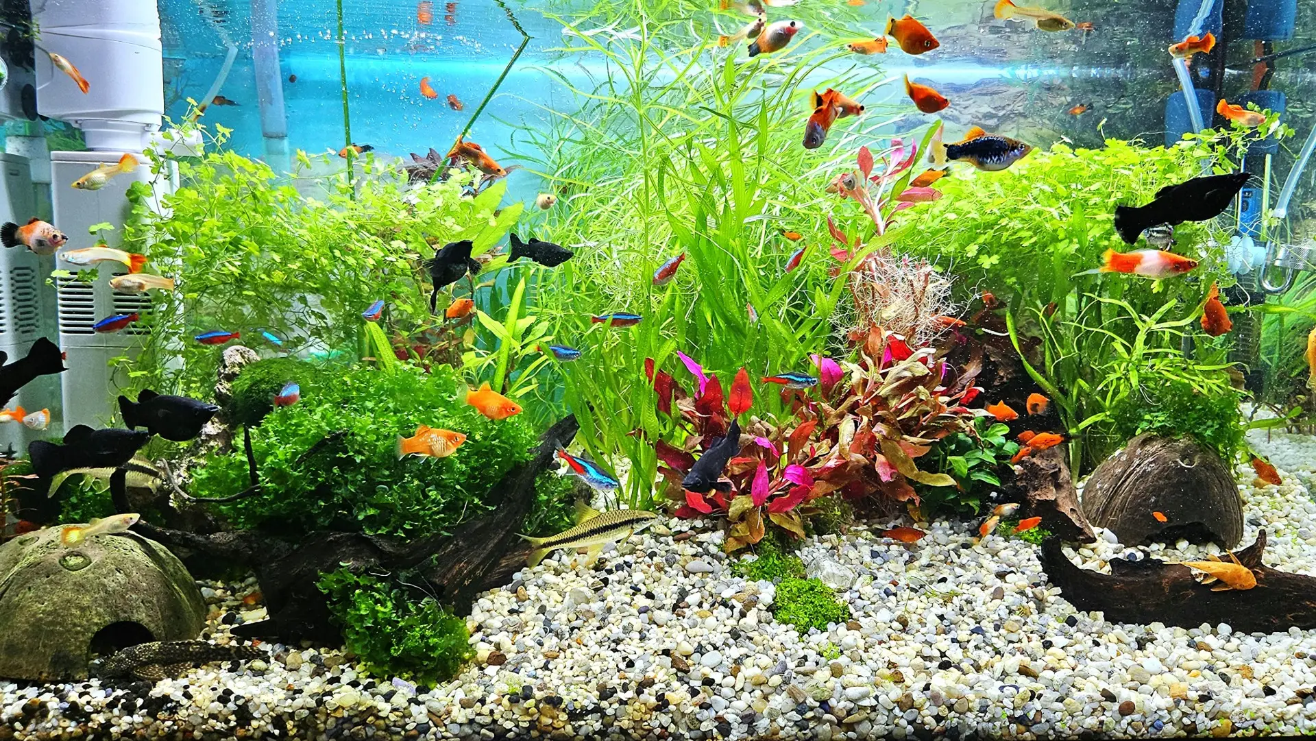 Filtrace: Bio filtr vnitřní, vnější filtr SUNSUN HW-603B (www.rostlinna-akvaria.cz/…) + Seachem Matrix, půdní filtr.