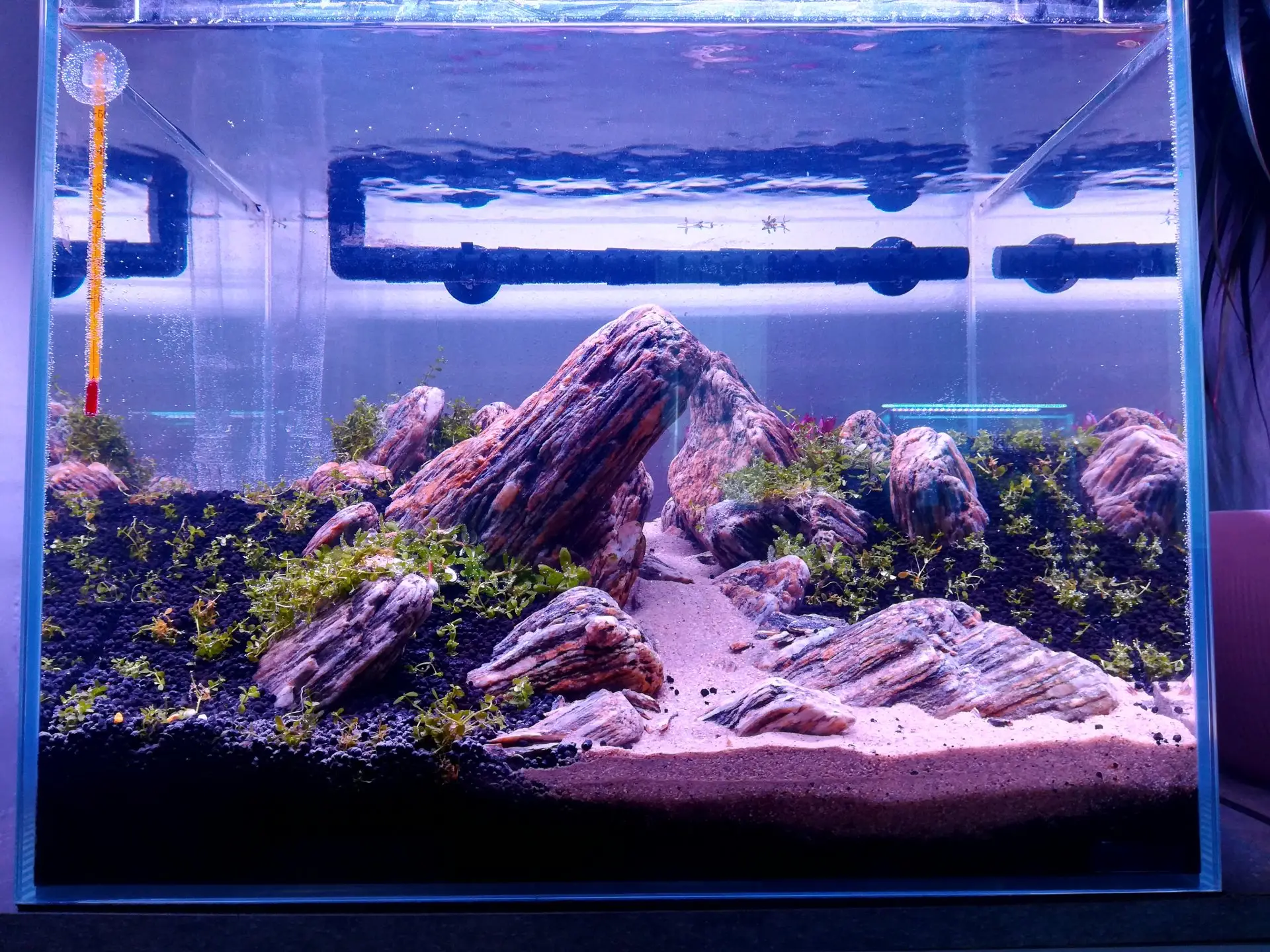 Poznámka: Akvárium se rozjelo metodou černého startu kde jsem nedodržel dobu jednoho měsíce ale cca 3 týdnů.Použil jsem invitro rostlinky měl jsem hnojit od prvního dne a ne týden čekat akorát jsem si tím způsobil komplikace.Neustále mě trápila ruducha