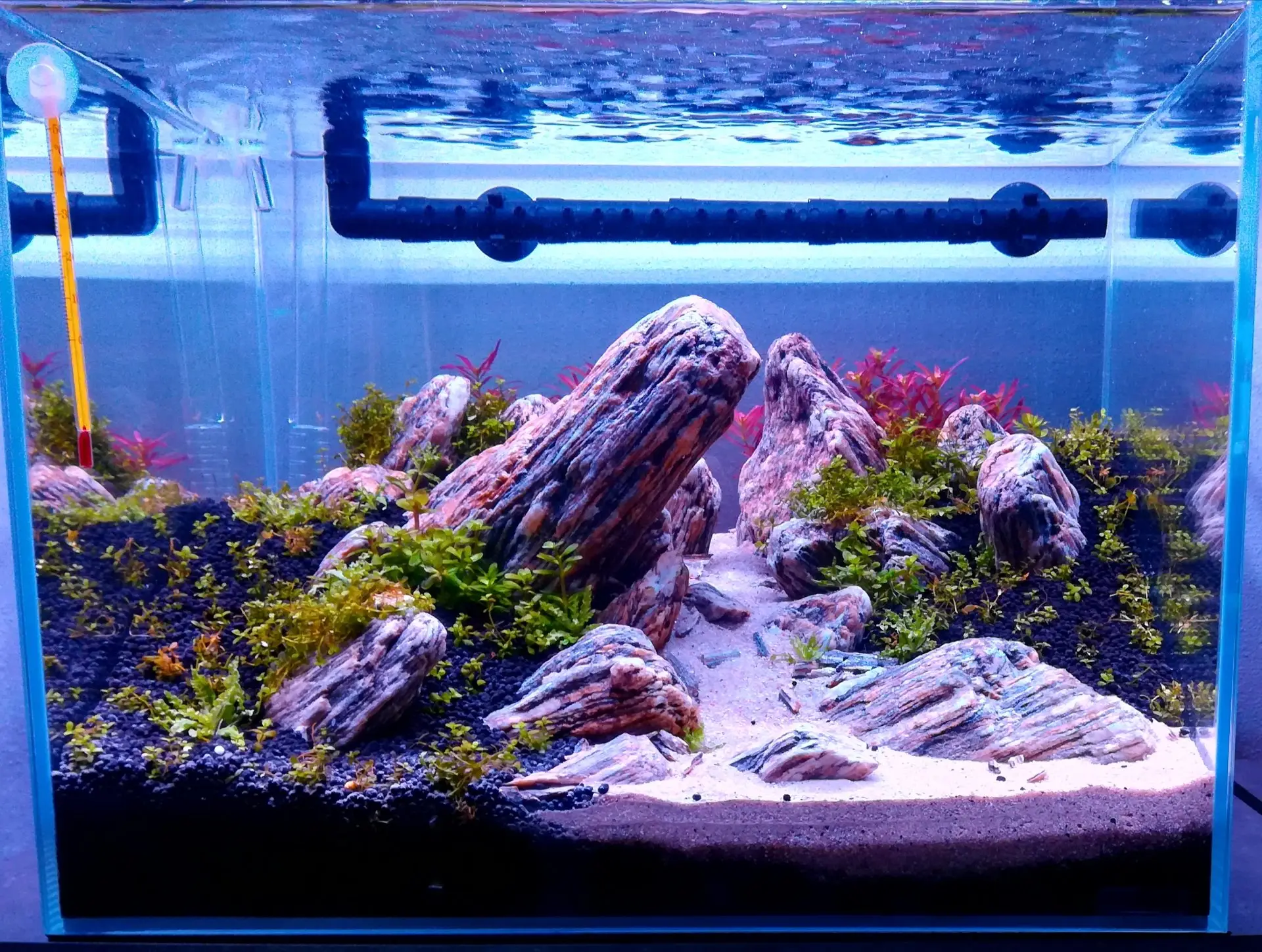 Poznámka: Akvárium se rozjelo metodou černého startu kde jsem nedodržel dobu jednoho měsíce ale cca 3 týdnů.Použil jsem invitro rostlinky měl jsem hnojit od prvního dne a ne týden čekat akorát jsem si tím způsobil komplikace.Neustále mě trápila ruducha