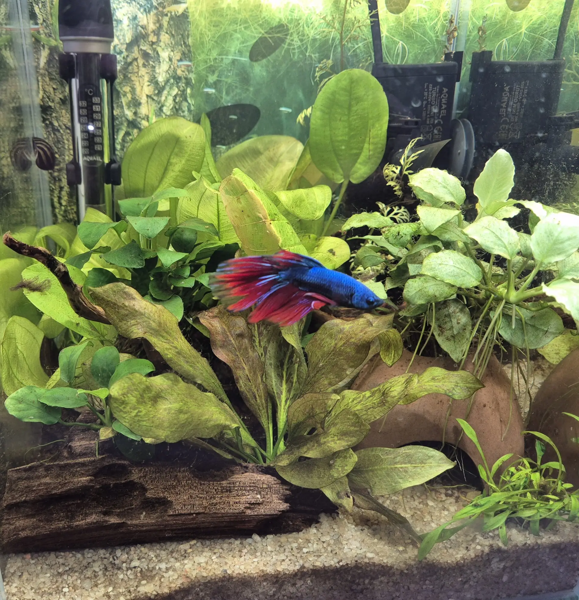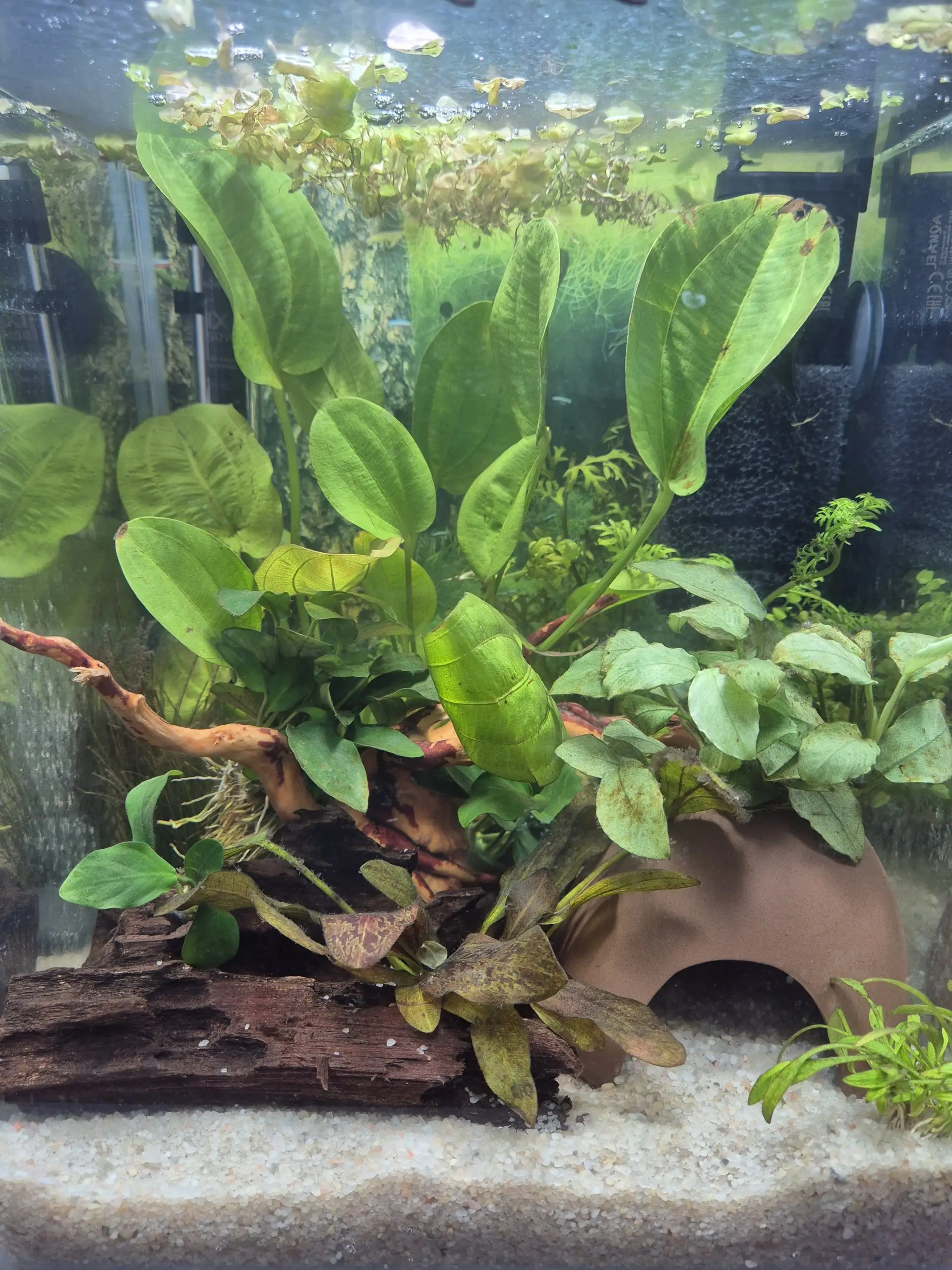 16 6.2025 | V sobotu jsem založila nové, větší akvárium pro beťáka. Zatím jsou v něm pouze rostliny a je trochu zakalené. |