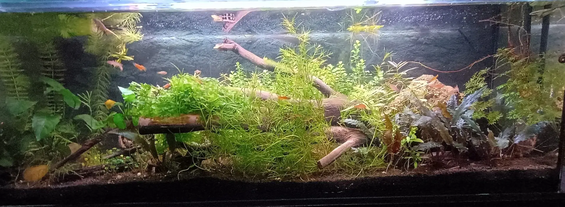 Skromně si musím říct, že se mi akva docela povedlo :)) jasné, řasa, klacek získává patinu, ale ryby si sedly, moc hezky se doplňují a líbí se mi jak se to zarostlo