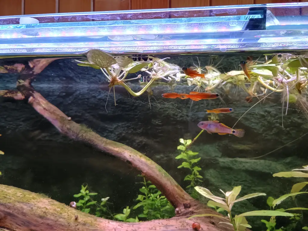 Tak teď si musím chvíli dát pohov a nešahat do toho. Když tam byli jen dospěláci, akva bylo hodně prázdné. Teď s potěrem, který je mnohem víc všude, je tam hezky pohyb. Bohužel limnobium se drží u filtru, místo na druhé straně, přehodila jsem kusy hnědovky, co jsem tam nastrkala a naopak sem si říkala že nebudu čekat a nastrkala jsem tam monoselenium do mezery ve dřevě.
