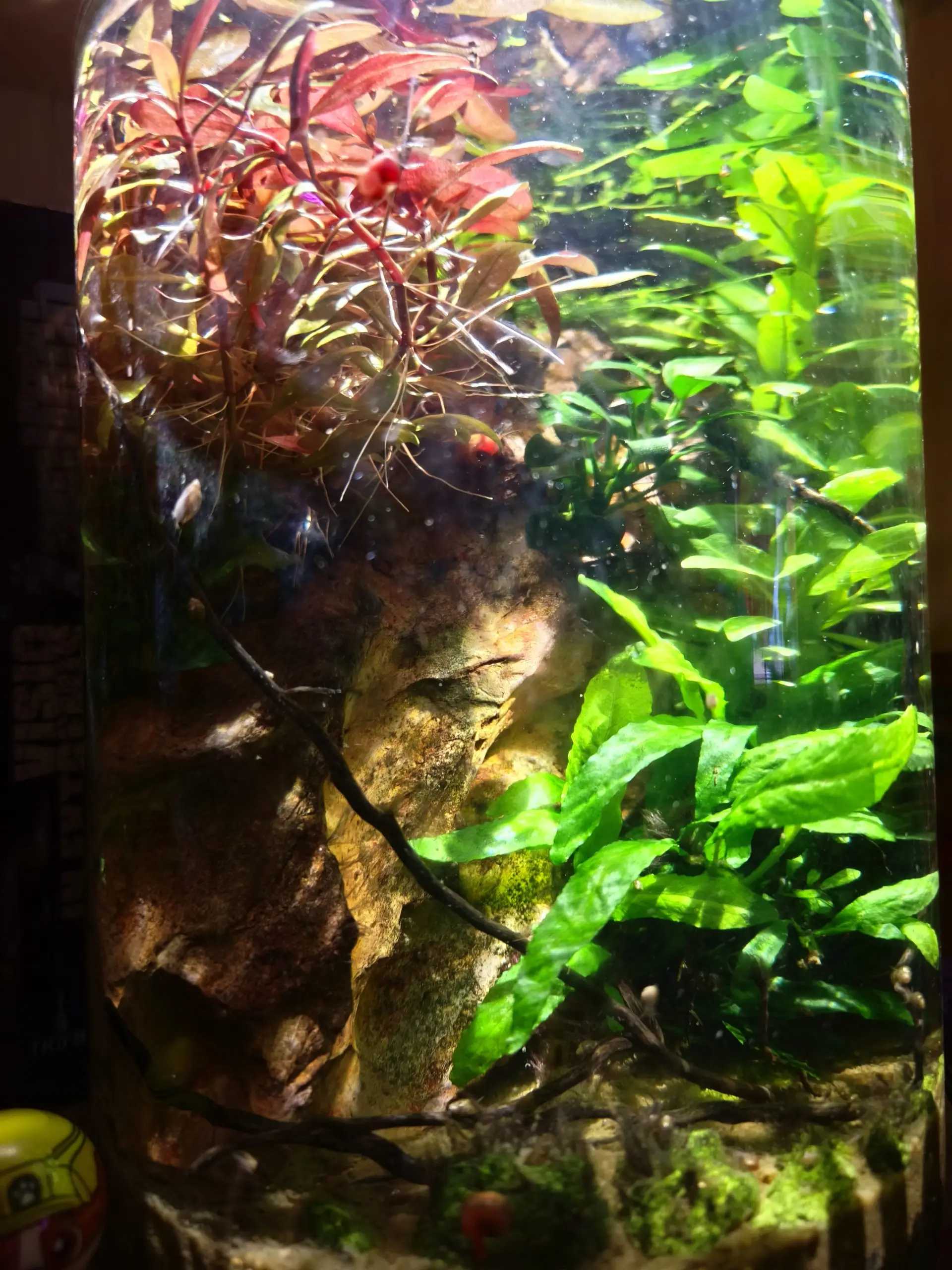 Popis: Tuto třílitrovku jsem založil kvůli čtverzubcově potřebě pravidelného obrušování "zubů", která vede k nutnosti zajišťovat mu stálý přísun okružáků. V ostatních akváriích je jich sice většinou dostatek (zvlášť ve dvou nejmenších), ale chtěl jsem je mít vždy v dostatečném množství a po ruce.