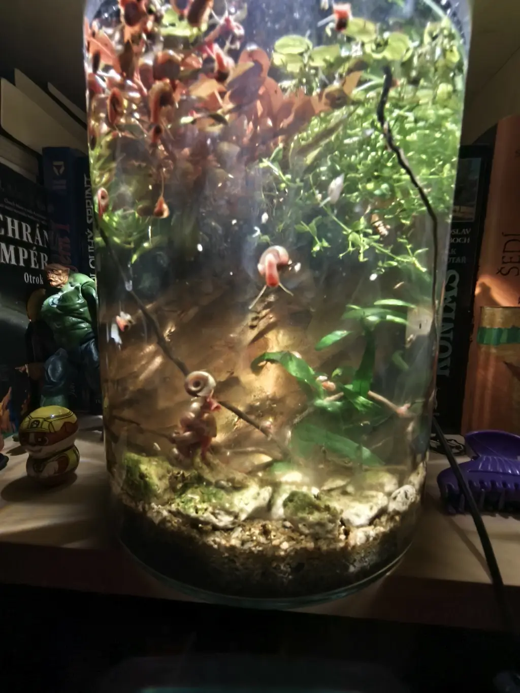 Šnečí farmička je pojata jako low-tech akvárium bez techniky pouze se světlem. Kromě chovu okružáků sem chci taky na zkoušku umisťovat různé druhy menších rostlin a testovat, jak jim to bez ostatní techniky půjde...