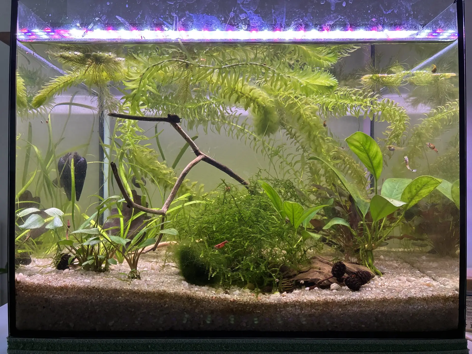 | 31 10.2025 | Bahnatce se rychlém růstu přestalo dařit, podezřívám krevetky - asi rostlinky lamou a možná i konzumuji. Pořídil jsem tedy od místního člena (darem) růžkatec a nějaké další plovoučky |