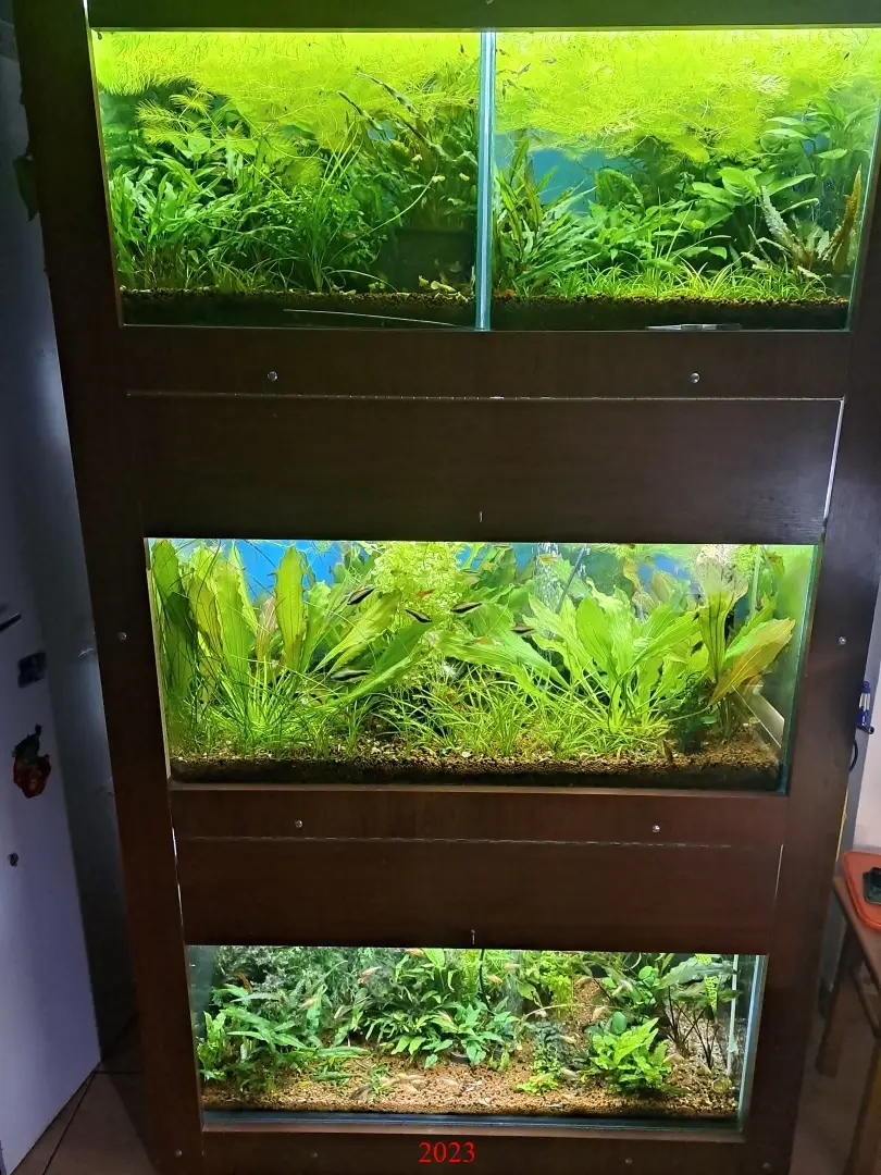 Popis: Stěna pořízena v říjnu 2019, z druhé ruky. Tři patra / 5ks akvárií. Jedno staré akvárium začalo téct, tak bylo nahrazeno novým. Druhé staré jsem přelepil a použil na sump pro 720l.