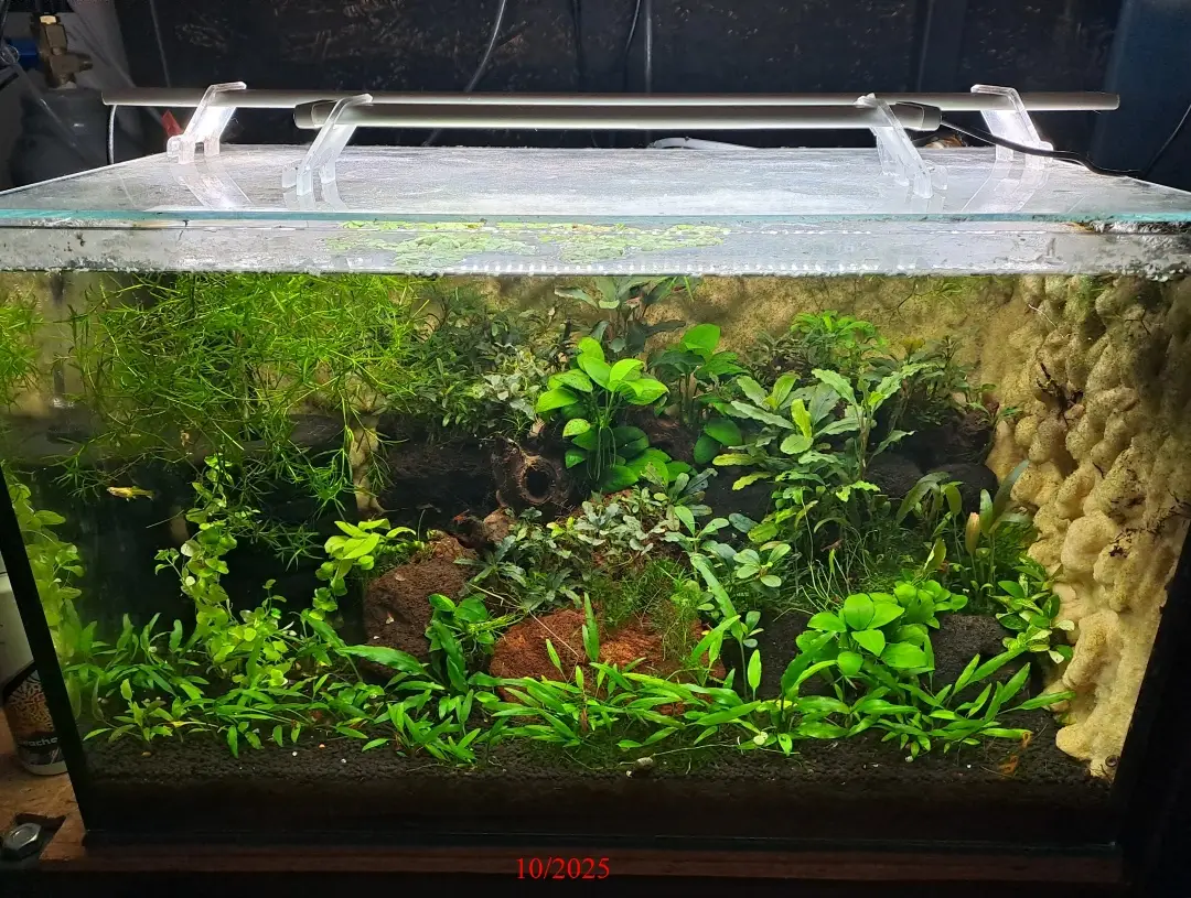 Hlavní foto je z minulosti. Aktuálně pouze voda a filtry, sloužící jako azyl pro ryby při předělávání jiných akvárií.