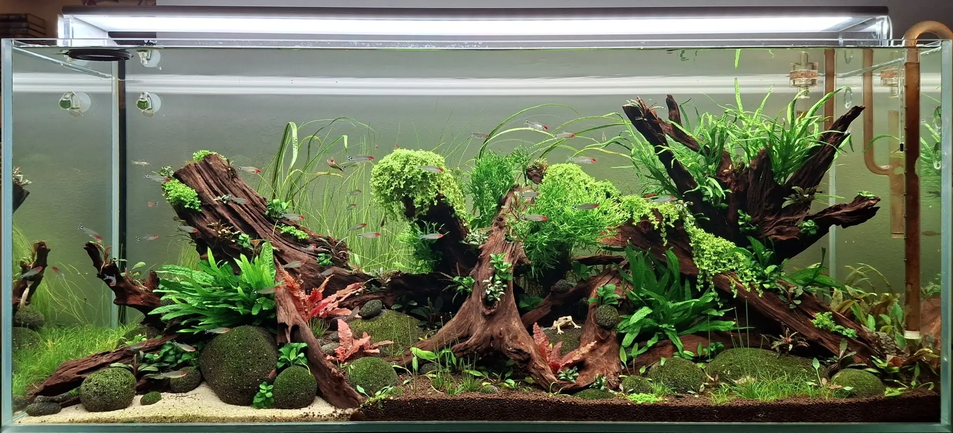 Dekorace: Mangrovové drevo, lávové kamene, ADA La Plata sand