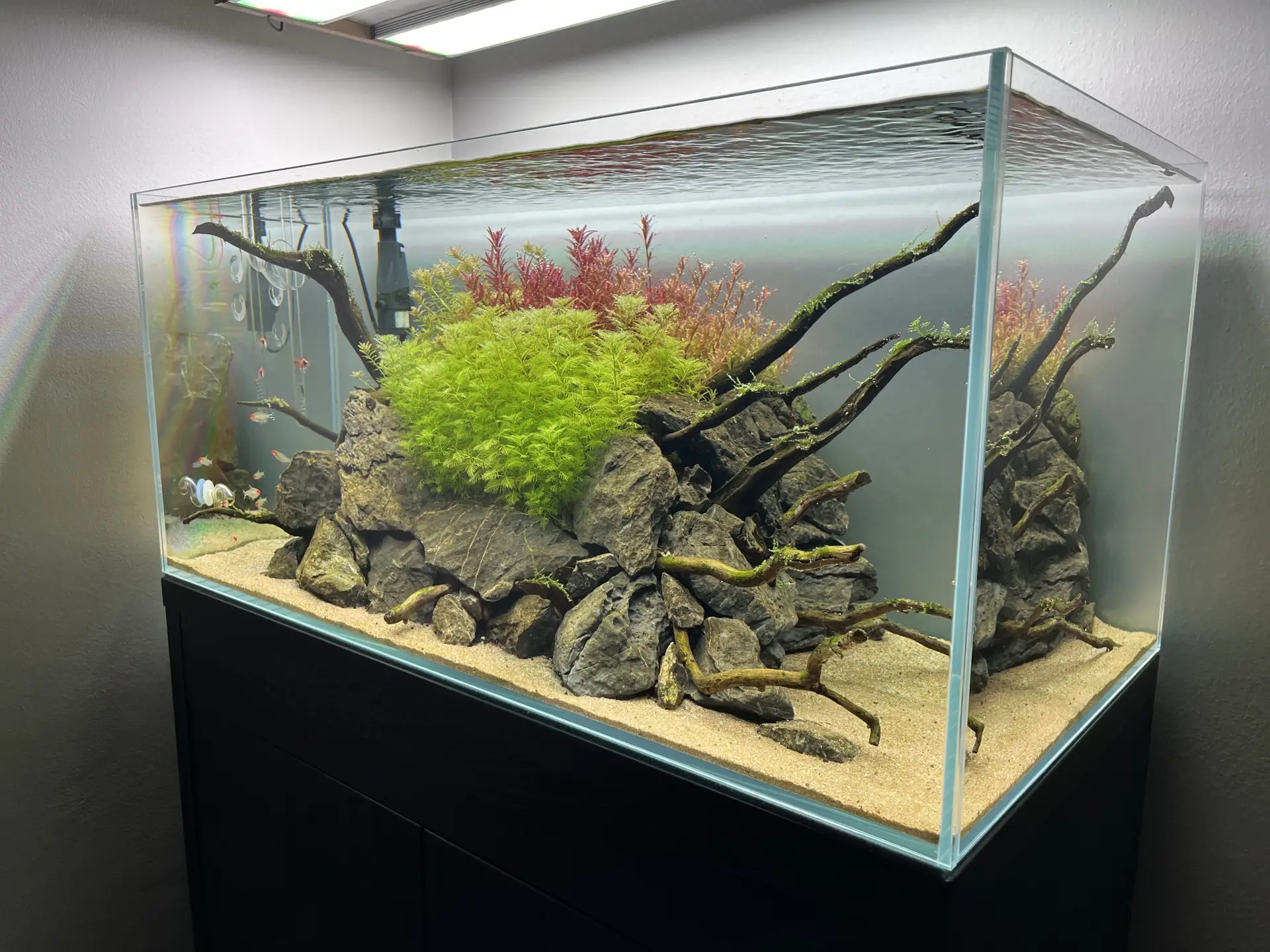 světla... Už minule se dark start osvědčil a vzhledem k tomu, že 30kg seiryu stone bylo málo a ani lávové kameny a kameny z místní přírody nestačily, netlačil jsem na start a snažil se dotáhnout hardscape ke spokojennosti... V pěti dnech jsem 3x vyměnil 70% vody, byť teda vzhledem k "zajetému, lépe řečeno vyjetému" zásobnímu substrátu a zajetému filtru to asi ani nebylo úplně nutné. Teď už jen vyčkat jak to bude růst... |