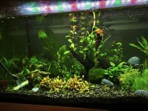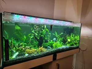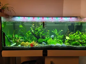 Popis: 100 l akva, zarostlé, žijí tam krevetky neocaridina davidi +-30ks, samec Betty, 3 ancistrusové, 15 neonek modrých