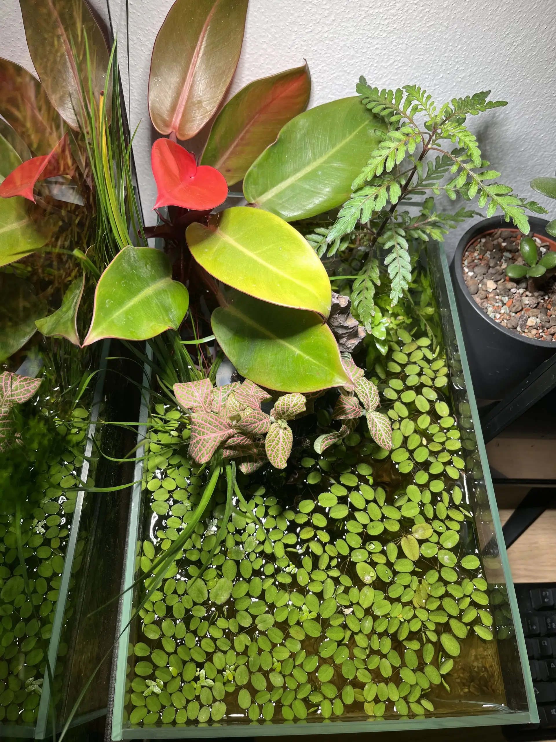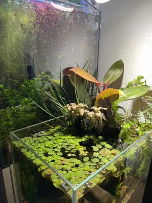 Filtrace: Filtr tam není, ale je tam malé čerpadlo s hadičkou pro "vodopád", filtraci zastávají rostlinky