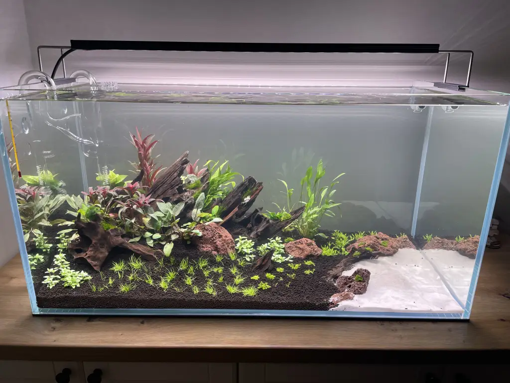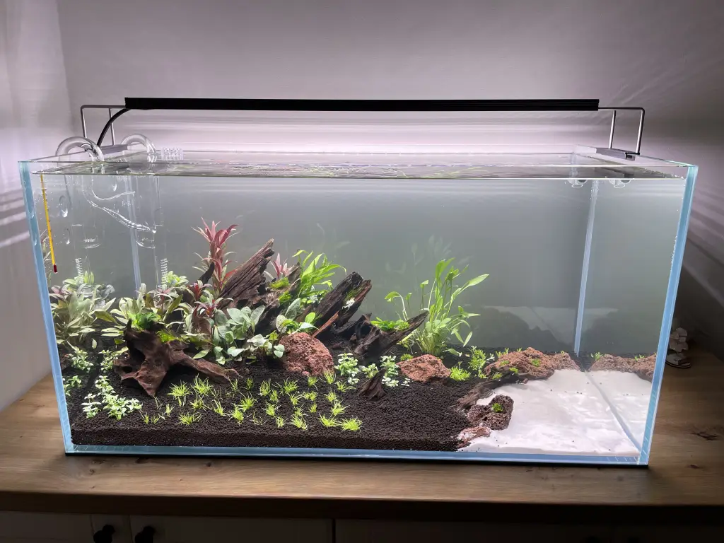 navržené kompozice. • Hygrophila corymbosa – 3 ks (košíček) • Anubias nana mini – 2 ks (košíček) • Alternanthera reineckii Pink – 2 ks (košíček) • Ludwigia peruensis – 1 ks (košíček) • Microsorium pteropus – 1 ks (košíček) • Cryptocoryne lucens – 1 ks (košíček) • Cryptocoryne petchii pink – 1 ks (košíček) • Cryptocoryne tropica – 1 ks (košíček) • Staurogyne repens (IN-VITRO) – 2 ks • Eleocharis sp. Mini (IN-VITRO) – 2 ks • Hygrophila odora (IN-VITRO) – 1 ks • Riccardia chamedryfolia (IN-VITRO) – 1 ks • Peacock moss (IN-VITRO) – 1 ks • Hygrophila pinnatifida (IN-VITRO) – 1 ks • Pogostemon helferi (IN-VITRO) – 1 ks Po napuštění nádrže byla zapnuta filtrace, spuštěno CO₂ a nastaveno osvětlení podle plánovaného cyklu. Voda byla ošetřena startovací bakteriální kulturou pro rychlejší zaběhnutí. Začíná období pozorování a stabilizace. |