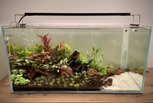 Údržba: Pravidelná údržba třikrát týdně – dvakrát týdně výměna přibližně třetiny vody s doplněním hnojiv, jednou týdně rozsáhlejší údržba zahrnující výměnu asi 40 % vody, prostřih rostlin.