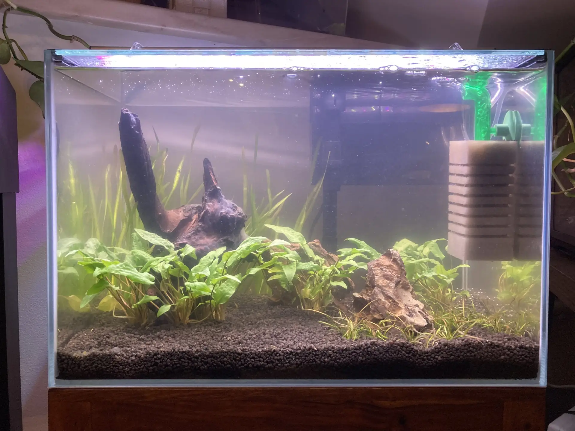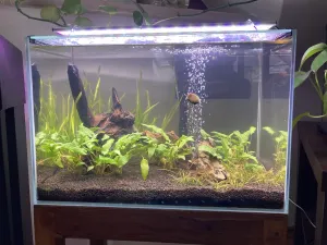 Popis: Po předchozích neúspěších 2. pokus o společenské akvárium. Jednoduché, low tech, původně v plánu s bublifukem, nakonec použit závěsný filtr, bez topení, 3 druhy nenáročných rostlin, bez hnojení. V plánu umístit jednoho šneka, 3 japonicy a 7x samce endlerky.