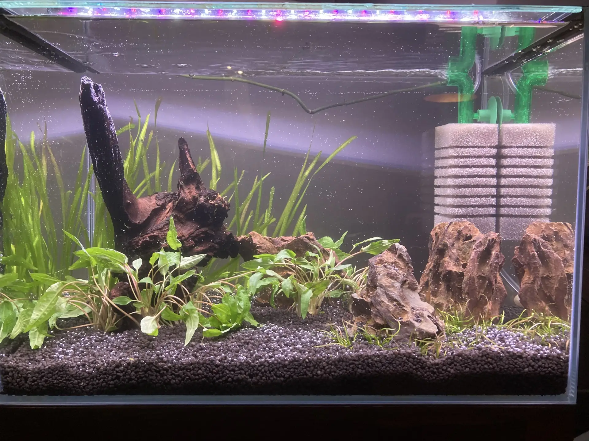 Popis: Po předchozích neúspěších 2. pokus o společenské akvárium. Jednoduché, low tech, s bublifukem, bez topení, 3 druhy nenáročných rostlin, bez hnojení. V plánu umístit jednoho šneka, 3 japonicy a 7x samce endlerky.