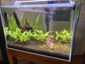 Popis: Po předchozích neúspěších 2. pokus o společenské akvárium. Jednoduché, low tech, původně v plánu s bublifukem, nakonec použit závěsný filtr, bez topení, 3 druhy nenáročných rostlin, bez hnojení. V plánu bylo umístit jednoho šneka, 3 japonicy (nakonec jsou jen dvě) a 7x samce endlerky (nakonec varianta Japan blue).