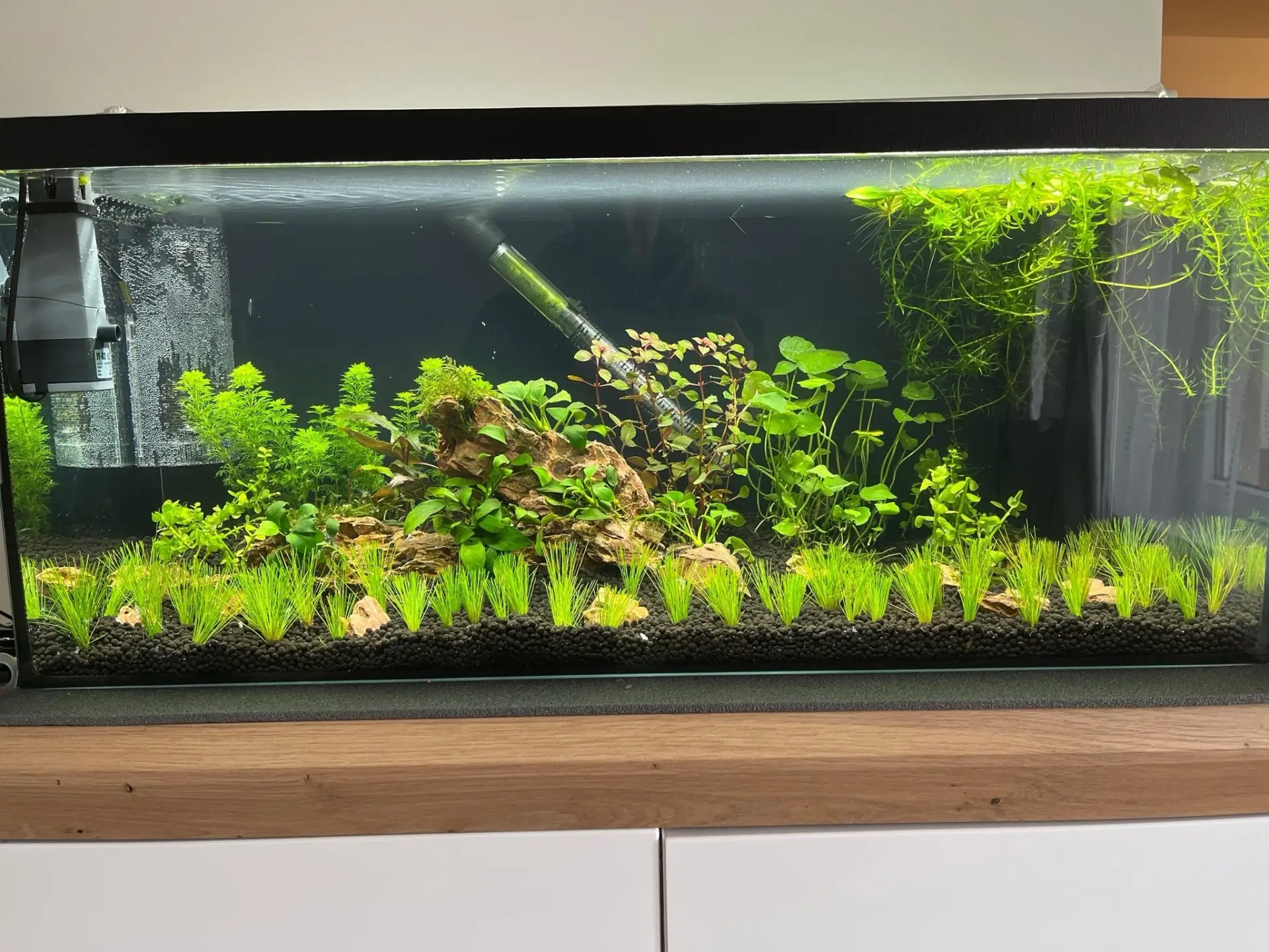 (ročanka vodní). Dnes jsem po návratu z dovolené provedl prostříhání rostlin a výměnu části vody. Poprvé dostaly i krevety něco k snědku - vytažený zbytky po hodině. Úhyn v nádrži je prakticky nulový, což beru jako skvělý signál, že je vše na dobré cestě. |