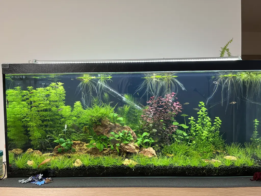 | 16 11.2025 | Testy vody vychází v pořádku, rozšířila se mi ale po akváriu "vodní blecha". Proveden tedy drobný prostřih rostlin a přidání nových osadníků nádrže - 5x japonika, 2x kreveta molucká, 5x otík a 8x Razbora klínoskvrnná. |