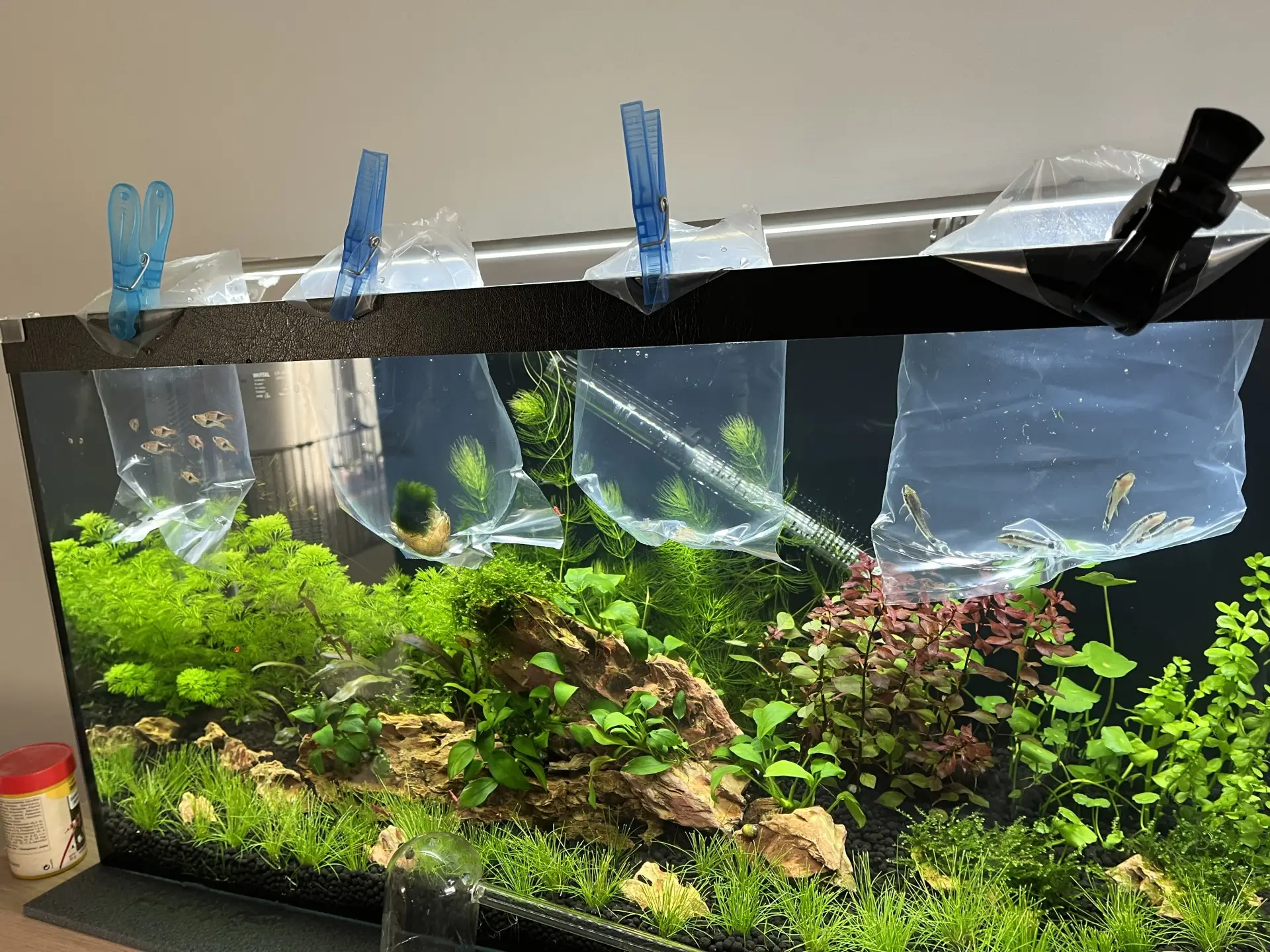 | 16 11.2025 | Testy vody vychází v pořádku, rozšířila se mi ale po akváriu "vodní blecha". Proveden tedy drobný prostřih rostlin a přidání nových osadníků nádrže - 5x japonika, 2x kreveta molucká, 5x otík a 8x Razbora klínoskvrnná. |