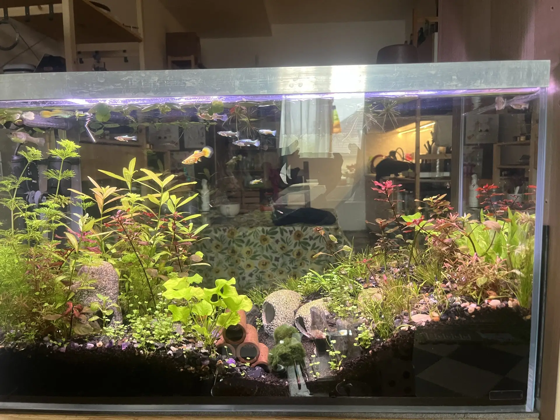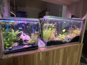 Rybkám jsem narychlo objednala 16L akvárijní set i s filtrem, světlem a topikem. Substrát, černý jemný písek, rostlinky a domeček/karafu). Akvárko jsme zajížděli skoro měsíc. Během té doby jsem si všimla, že se ryby otírají a doufala jsem, že to přestane, až přijdou do nového/většího