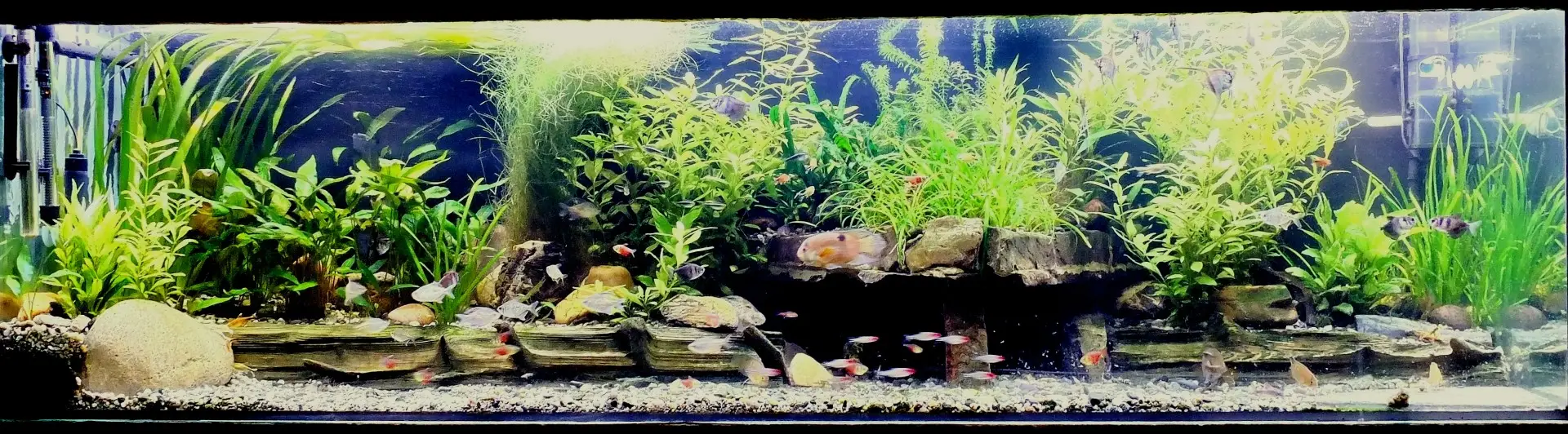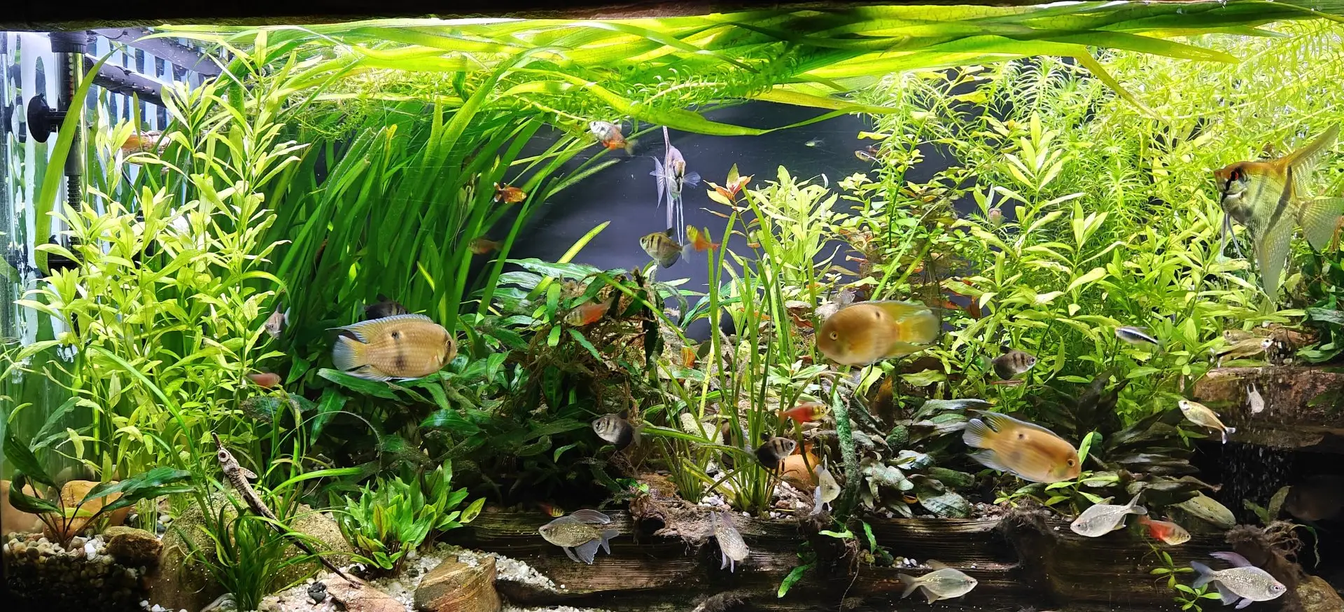 Biotop: O přísný biotop jsem se nesnažil, ale dá se říct, že ryby jsou z 95% amerika. U rostlin je to mix, hlavně jsem volil rychle rostoucí kvůli snažšímu zaběhnutí akvária.