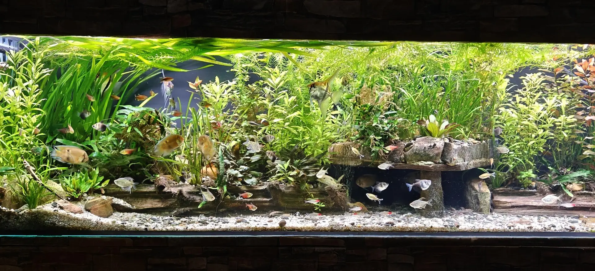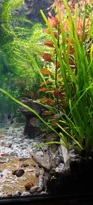 Popis: Skla tohoto akvária jsou stará přes 20 let, ale v září 2025 došlo k rozlepení lepeného spoje a částečnému vytečení akvária. Po katastrofě, kterou raději nebudu popisovat následoval odvoz sklenářskou firmou jeho rozebrání očistění a znovuslepení. Poté následoval restart za použití původního vnitřního vybavení. Bylo nutné doplnit rostliny, neboť ty 14 denní pobyt v kýblech většinou nepřežily. Ryby většinou přežily v plastovém sudu, ale i tak jsem zvětšil hejna.