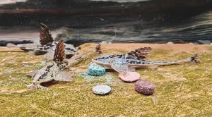 Dekorace: Několik pískovcových placáků z nichž je utvořena terasa a jeskyně pro akary a dopadové místo pro krmné tablety a vůbec všechno krmení, které nestačí ryby sežrat a spadne na dno. Dále většinou křemenné valouny s tříděným říčním pískem, doplněným dřevem z místního rybníka důkladně vyvařeným.