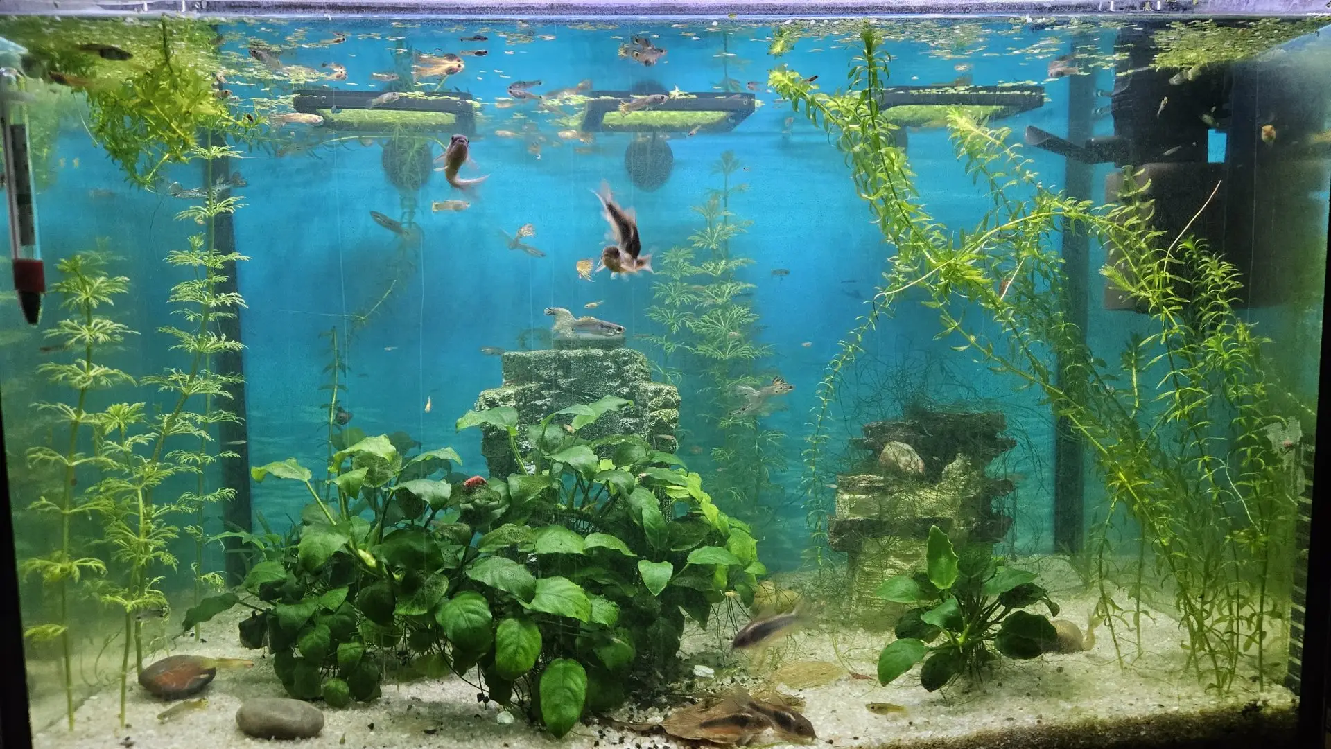 Popis: Dříve: Nekomplikované akvárium s gupkami, anubisy, okružáky. Občasná výměna vody a nekonečné odstraňování řas.