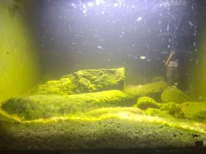 Krmení: na začátku hladká mouka a krmivo z různých sušených mletých řas, teď už je řasa rozrostlá natolik, že se krmí sami